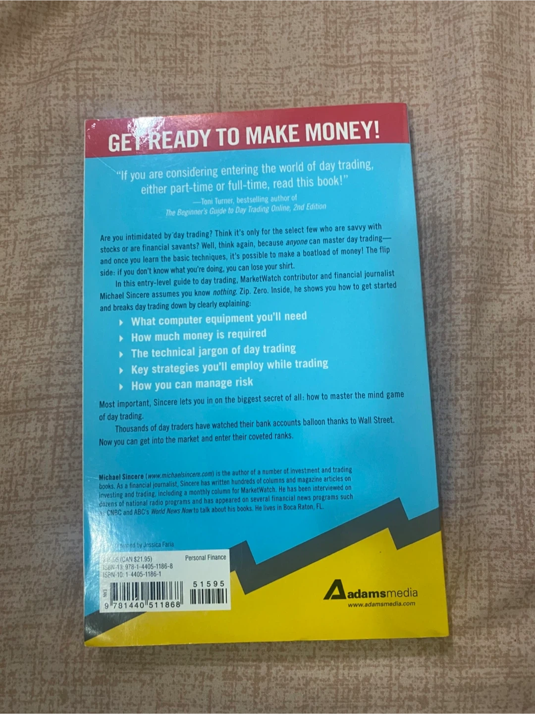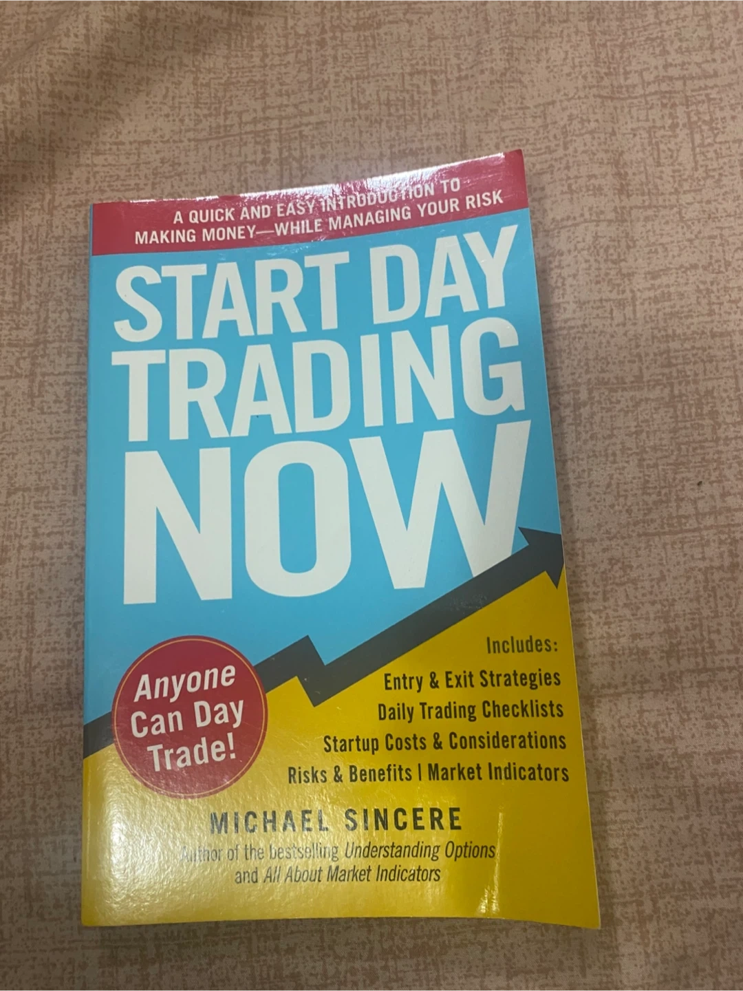 Selling the book 'Start Day Trading Now' by Michael Sincere. It's a guide to making money while managing your risk, covering entry and exit strategies, daily trading checklists, startup costs, risk and benefits, and market indicators. If you're interested in learning about day trading, this book is a great introduction!