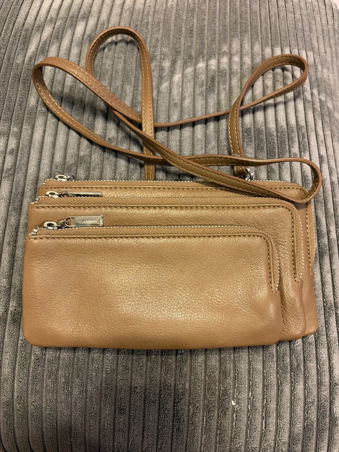 Danier leather crossbody bag! It's a tan leather bag with a long strap. It has multiple zippered compartments. Like new.