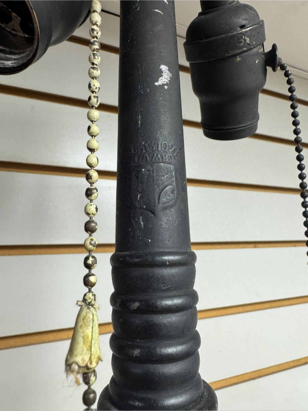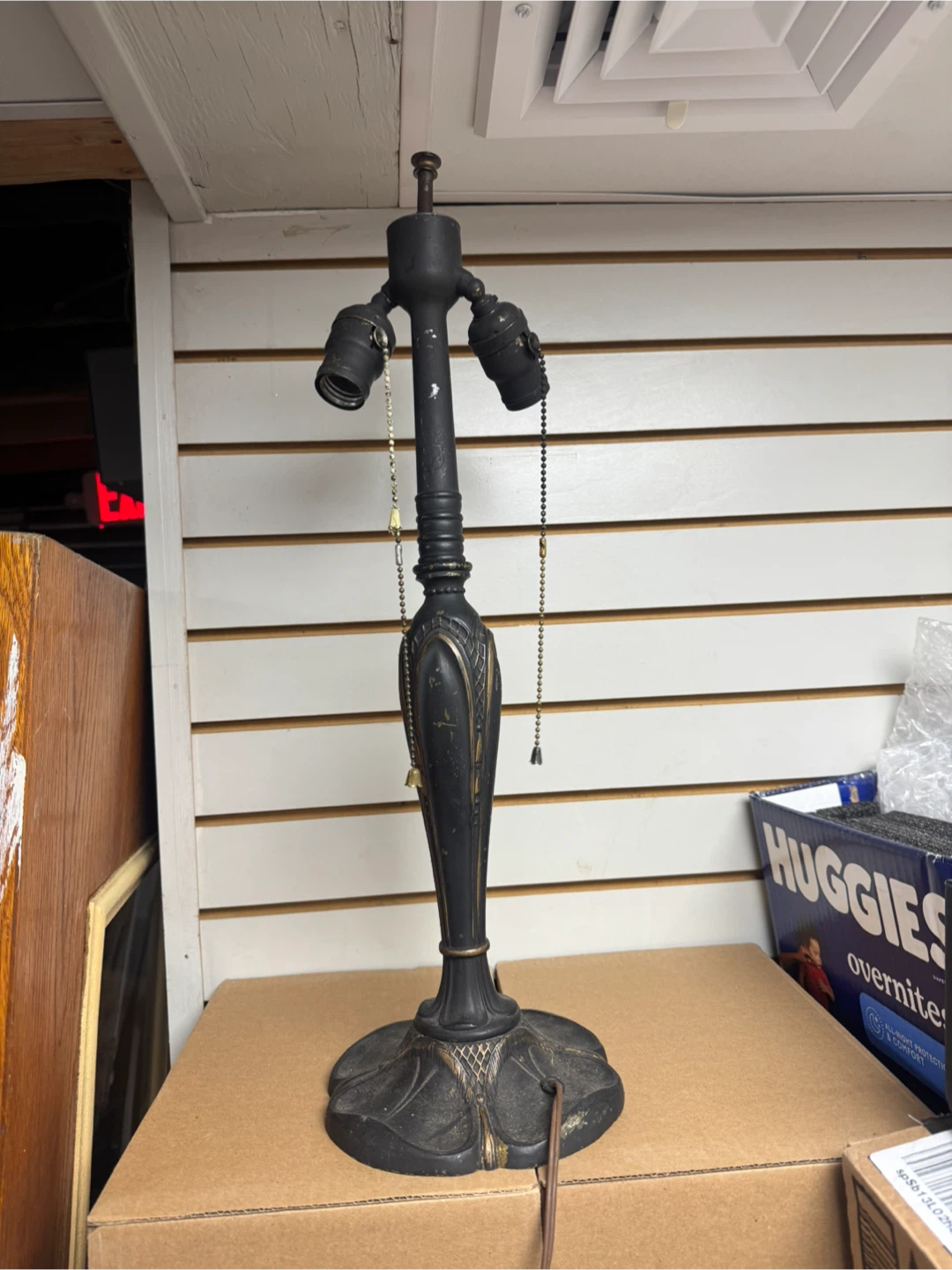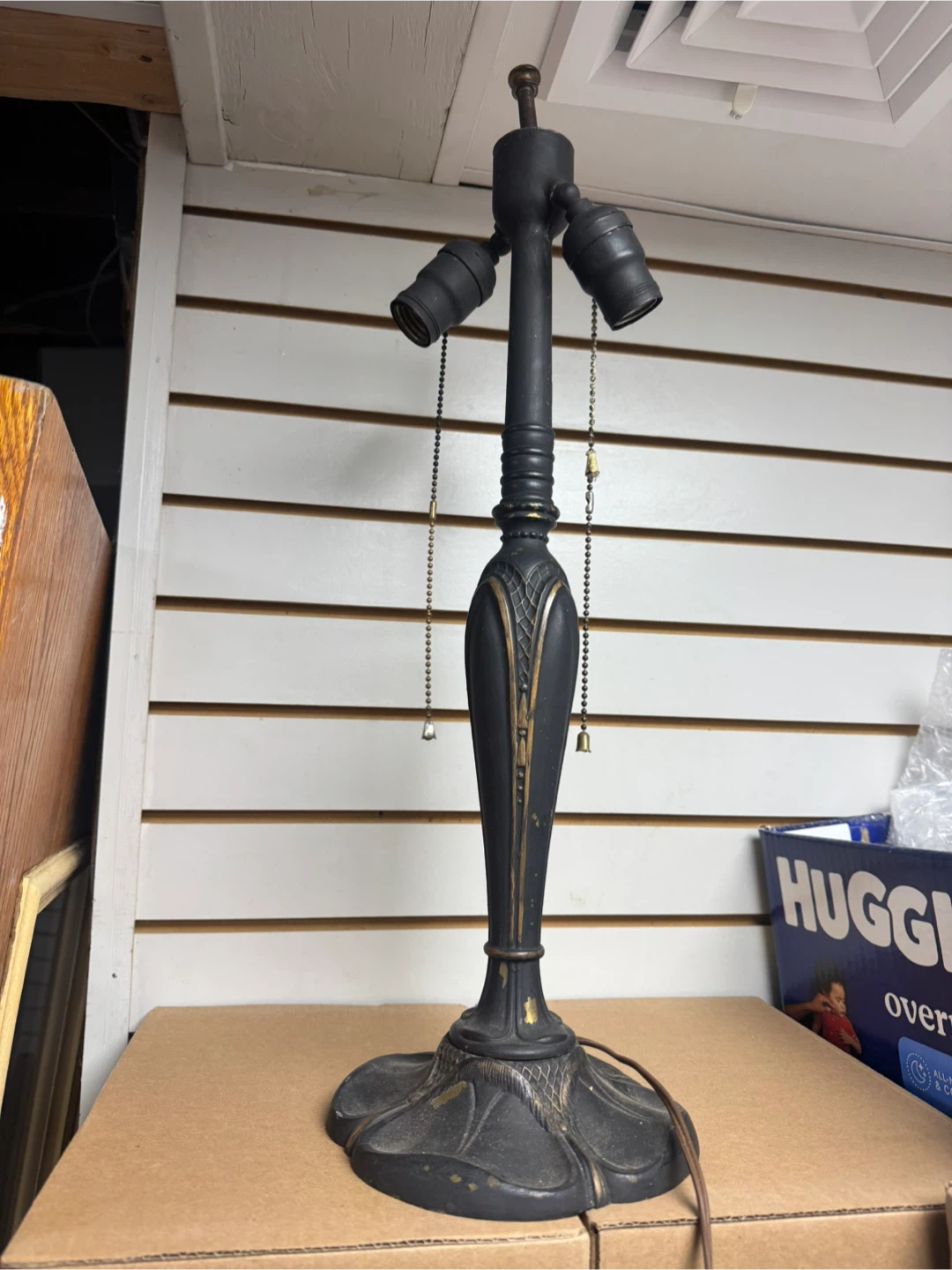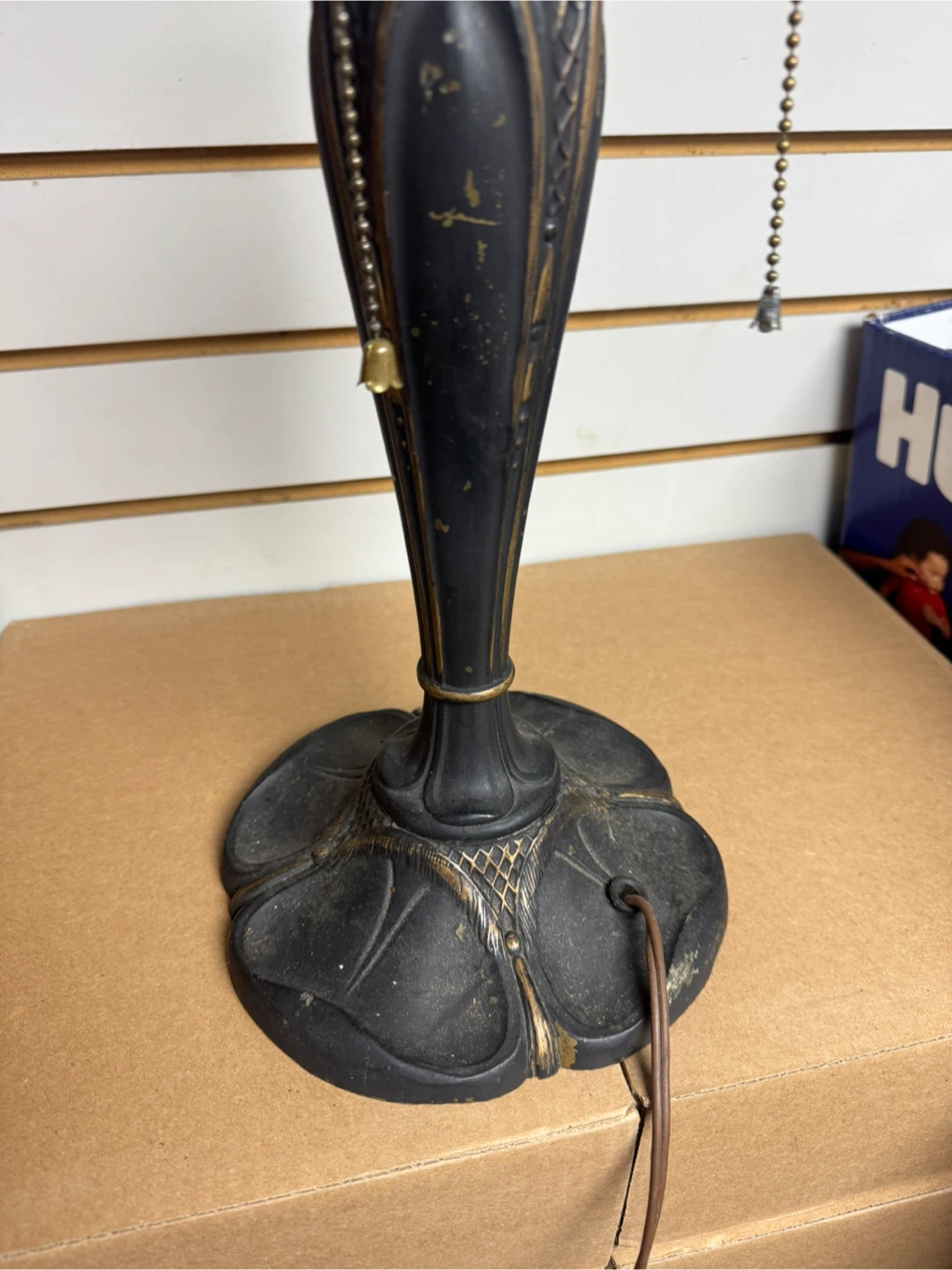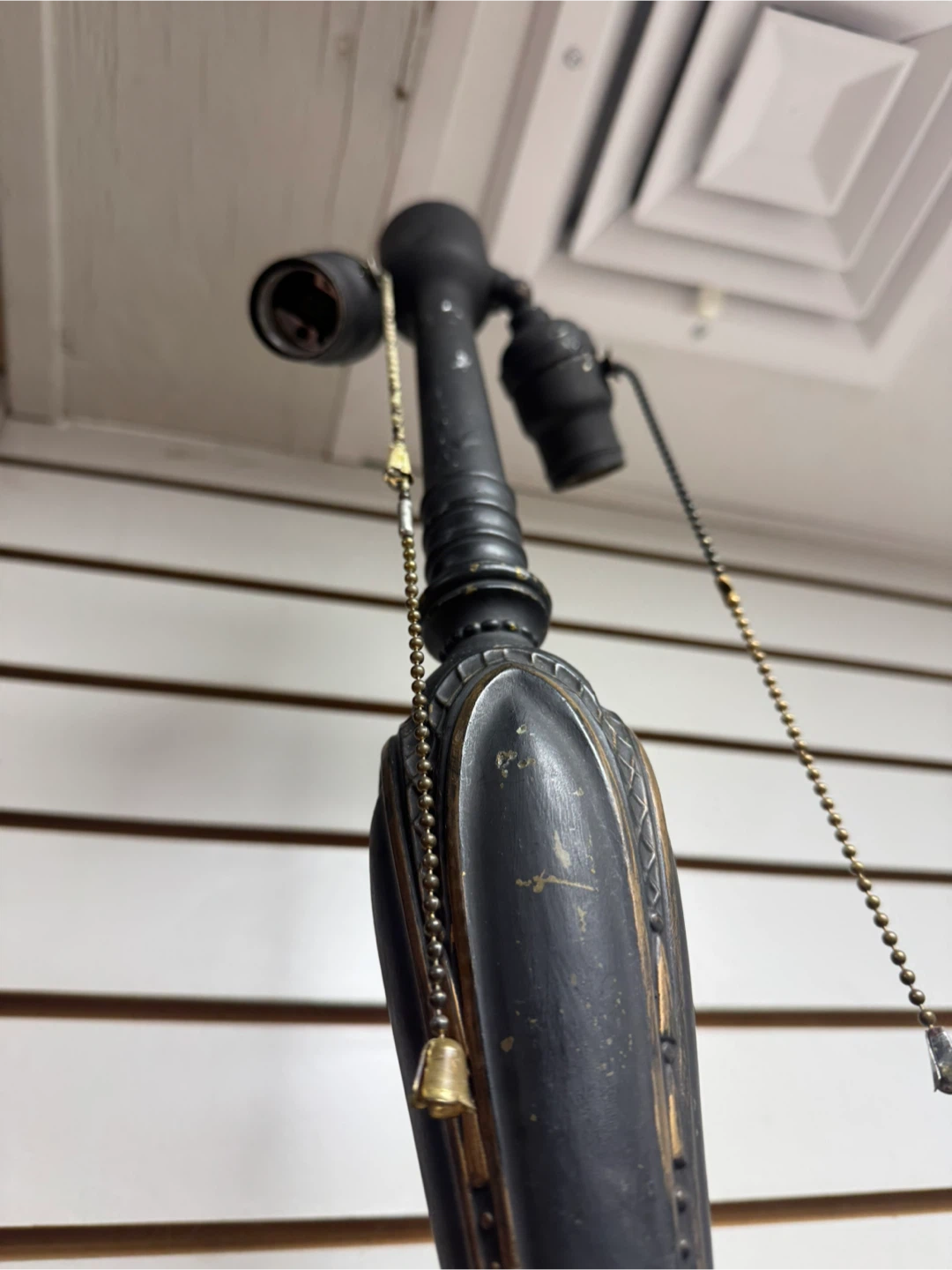 Selling a vintage lamp. It shows some signs of wear, but still has a lot of charm! The lamp has a black finish with gold accents and decorative chains. In good working condition.