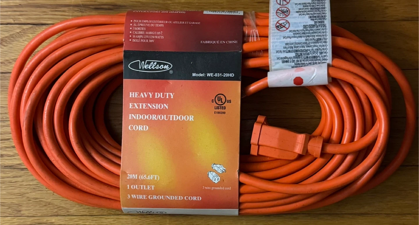 Selling a brand new Wellson heavy-duty extension cord. It's 20 meters (65.6 ft) long and suitable for indoor or outdoor use. This is a 3-wire grounded cord with 1 outlet. Model number is WE-031-20HD. Perfect for your outdoor or indoor work.