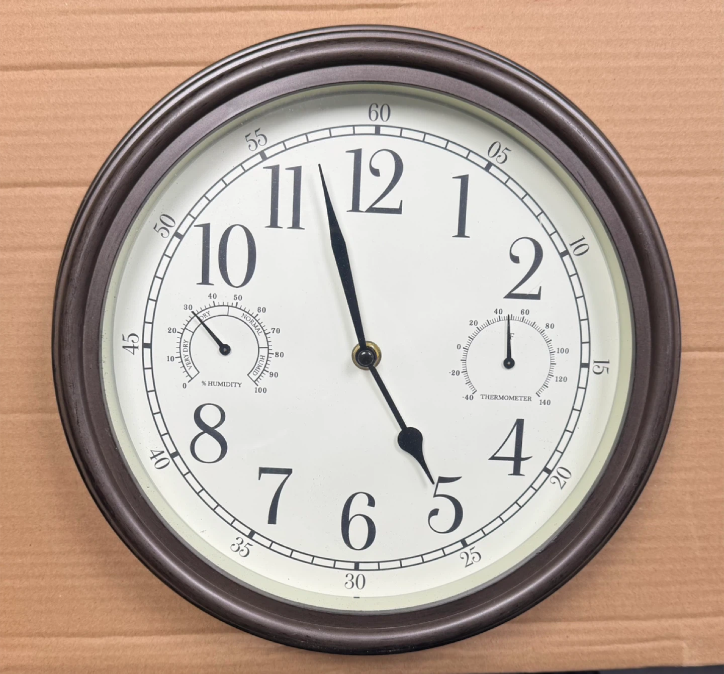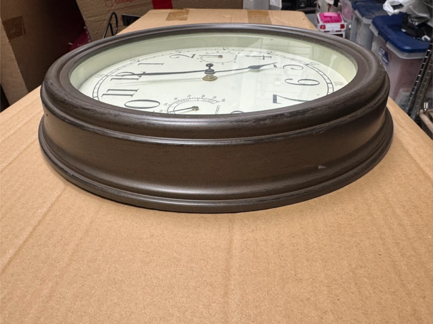 Selling a wall clock with a thermometer and humidity display. It's in good condition and perfect for any room in your home. It has a classic design that will complement any decor
