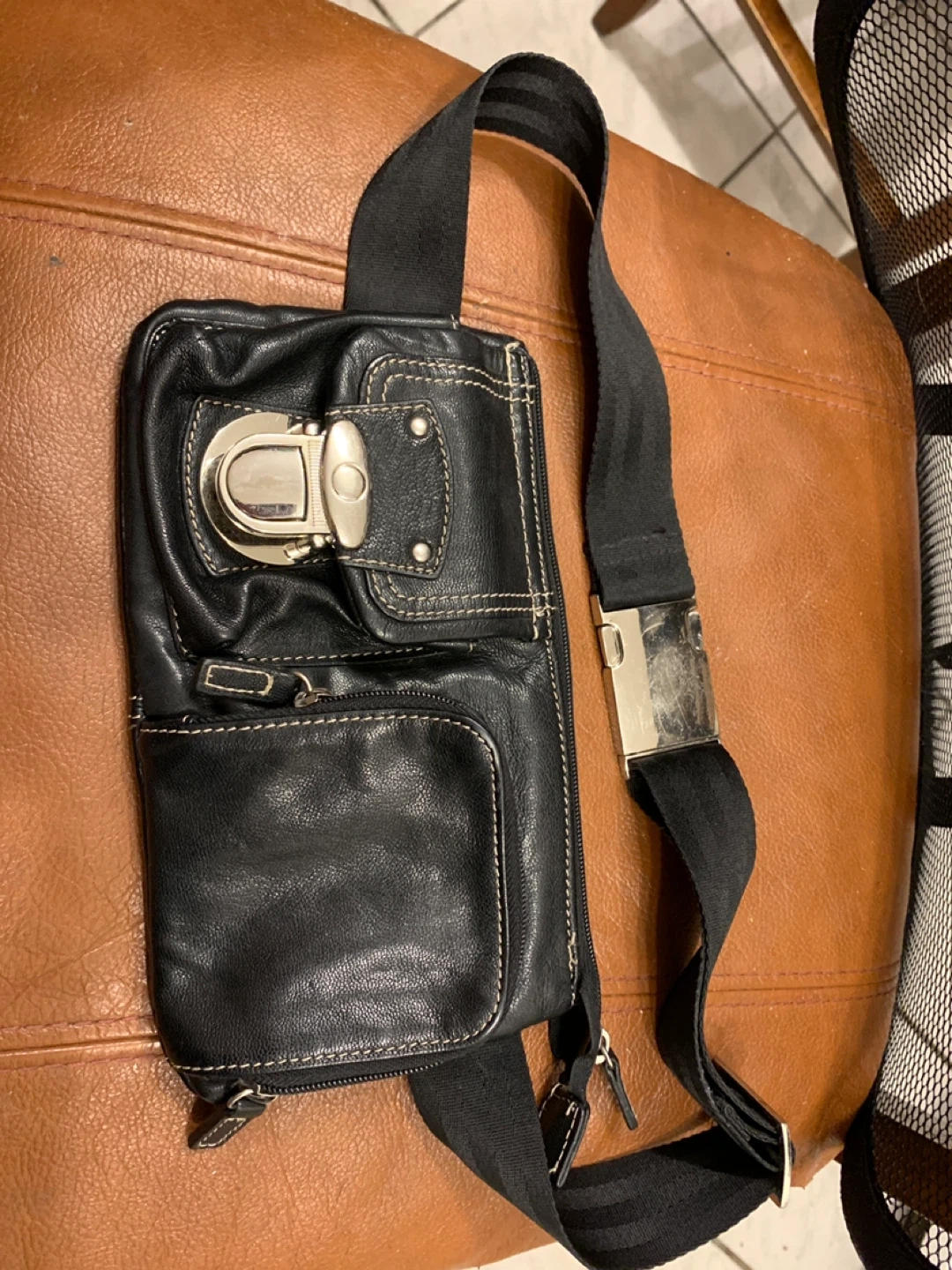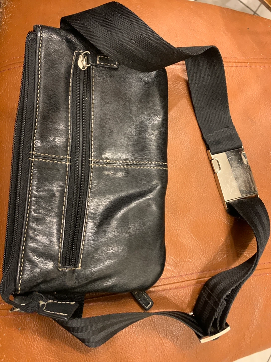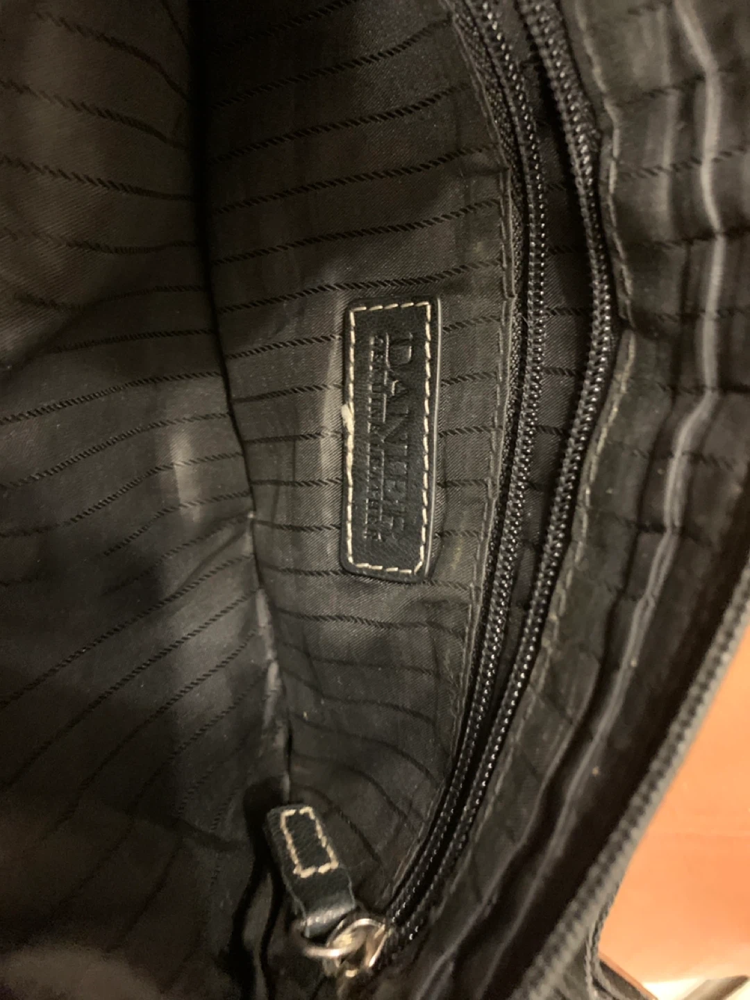Selling a Danier crossbody bag in black leather! It's got a stylish design and is perfect for carrying your essentials. The adjustable strap makes it easy to wear comfortably. It's in great condition and ready for a new owner
