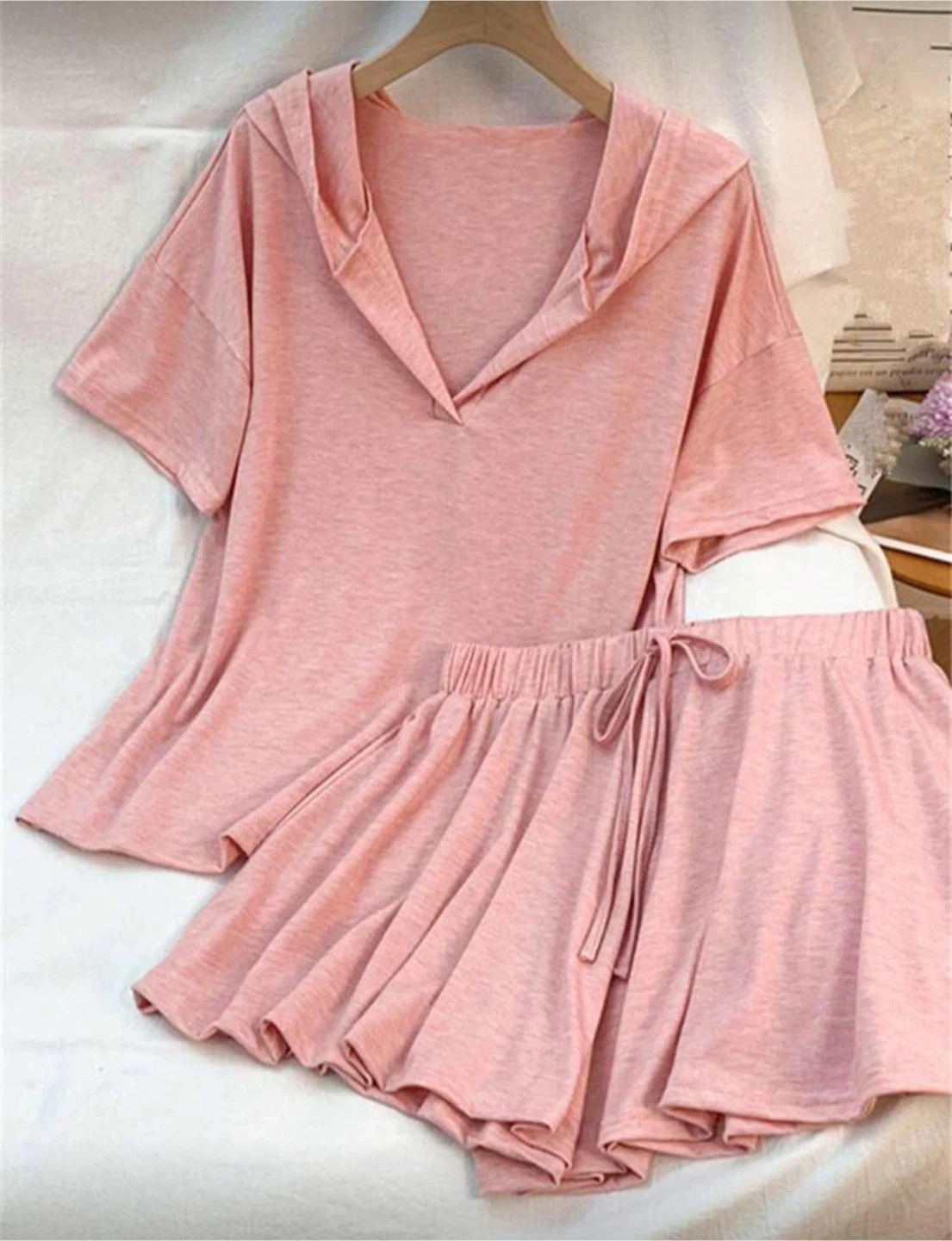 Selling a cute pink matching set! It includes a comfy hoodie and a pair of shorts with a drawstring. Perfect for lounging or a casual day out