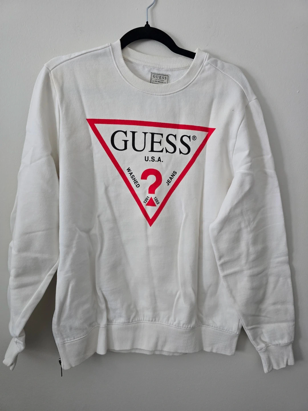 Selling a Guess U.S.A. sweatshirt in white. It's a size medium and in great condition. The classic Guess logo is featured prominently on the front. Perfect for casual wear!