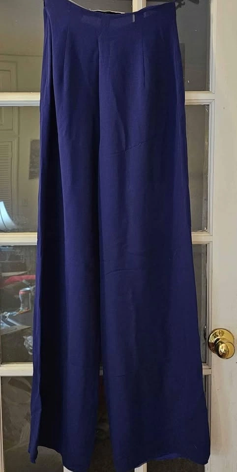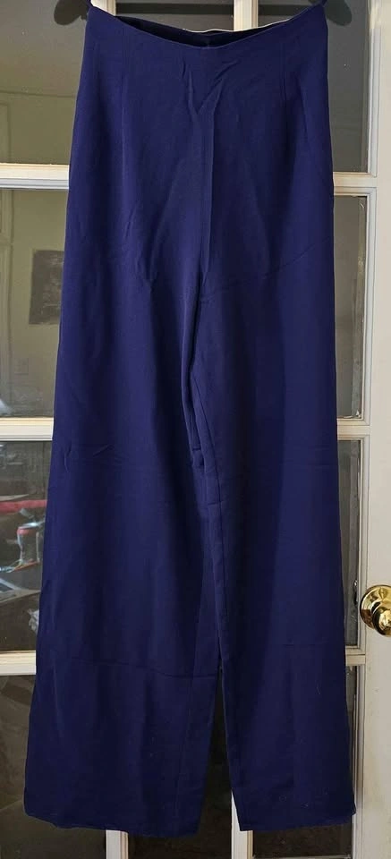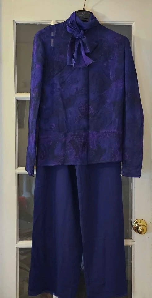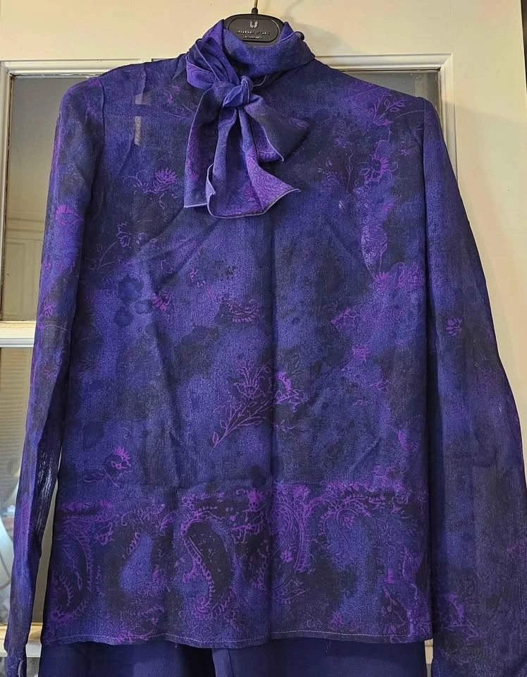 Ungaro made in Italy blue dressy lined sheer pants no belt just a zipper & hook on side. Blouse is same blue but with purple flower pattern, sheer with long neck tie.