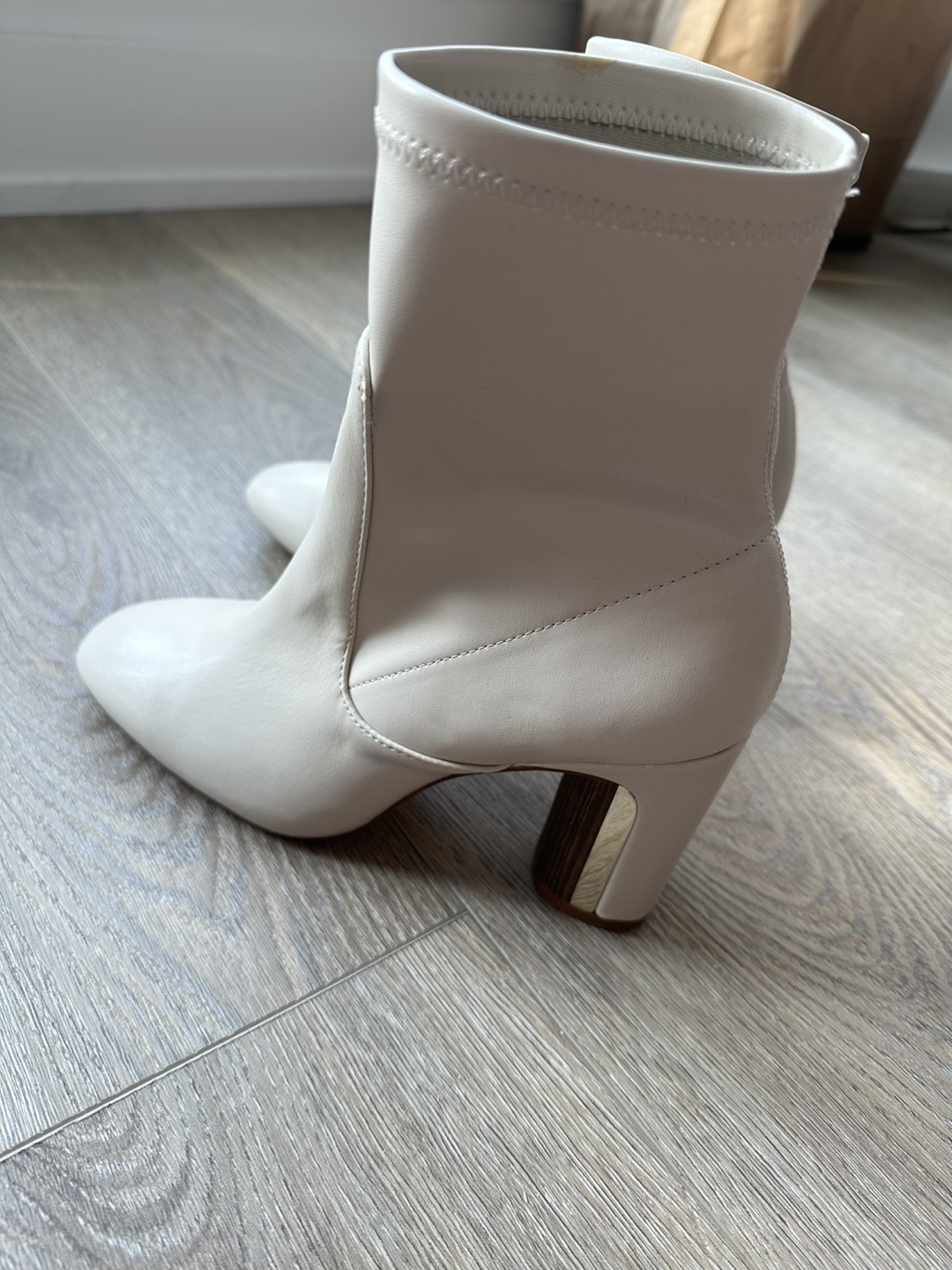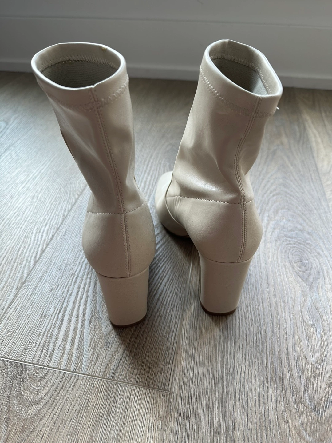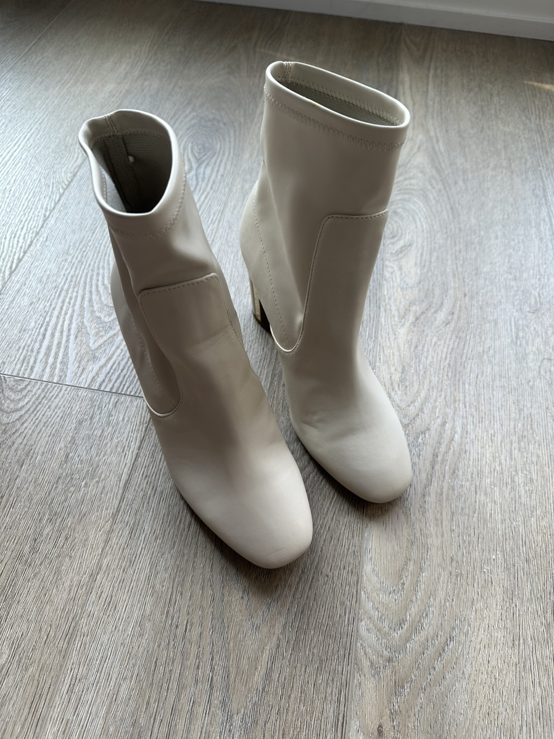 Ankle boots with rounded heels in an ivory shade from Zara. The heel height is 3.25 inches. Has a faint blue-ish mark on the left boot (see photo). Only worn once. ❗️Needs to be gone by early July! Whatever isn’t picked up by then will be donated. Feel free to browse my other listings if you’re interested! If you purchase multiple items I can provide a discount. :) Condition: Like new Brand: Zara Size: 38 / US 7.5