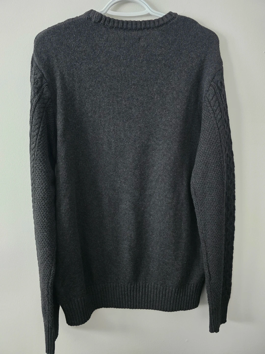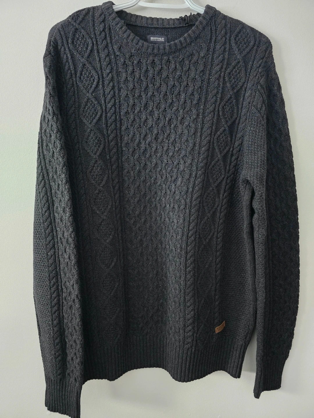 Cozy Buffalo David Bitton sweater in a nice dark grey colour. It's a size M/M and looks great for those chilly days! The material is soft and has a nice textured knit pattern.
