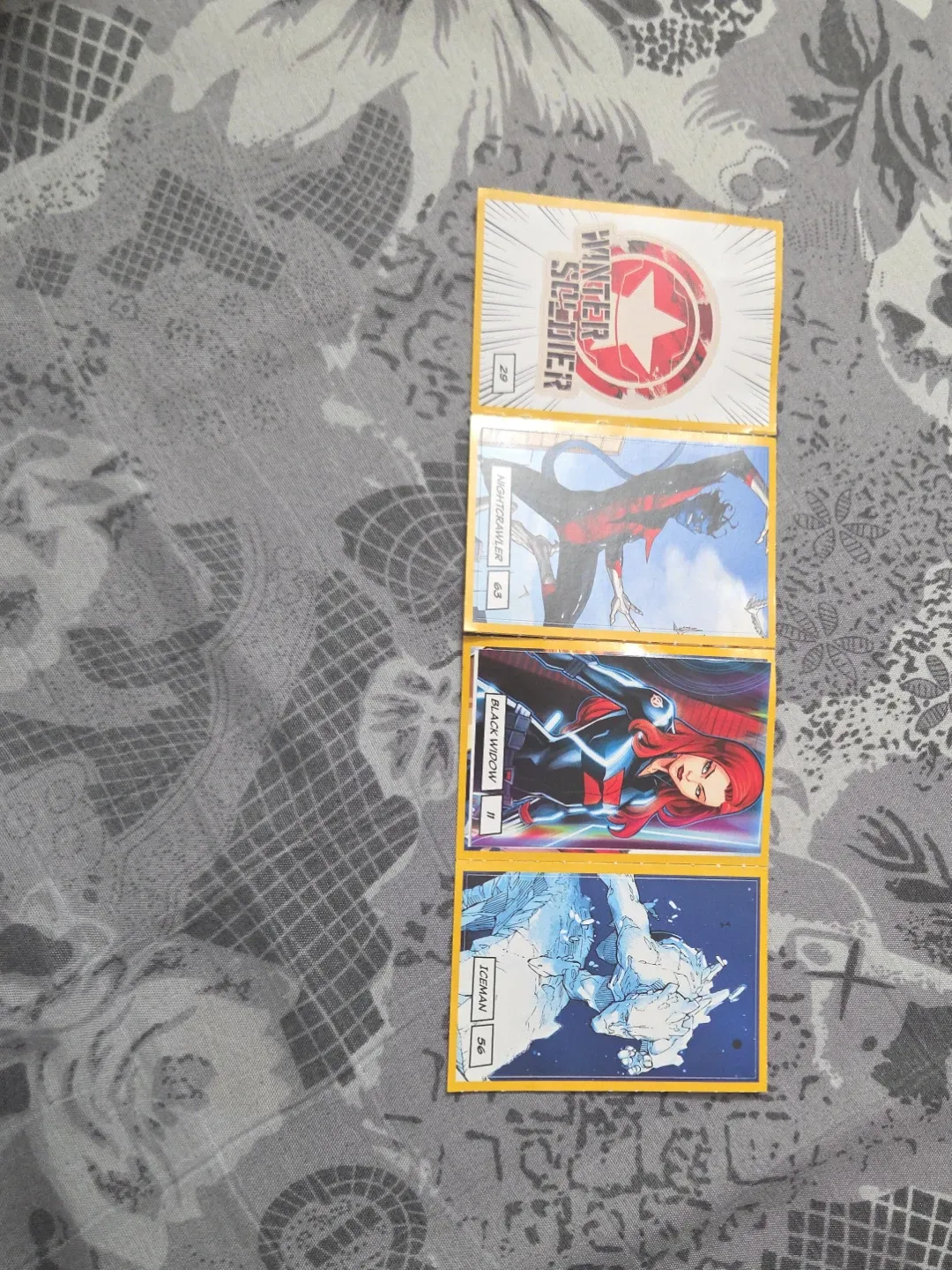 Selling a set of Marvel Comics trading cards featuring characters like Winter Soldier, Nightcrawler, Black Widow, and Iceman! They're in great shape and ready for a new collector.