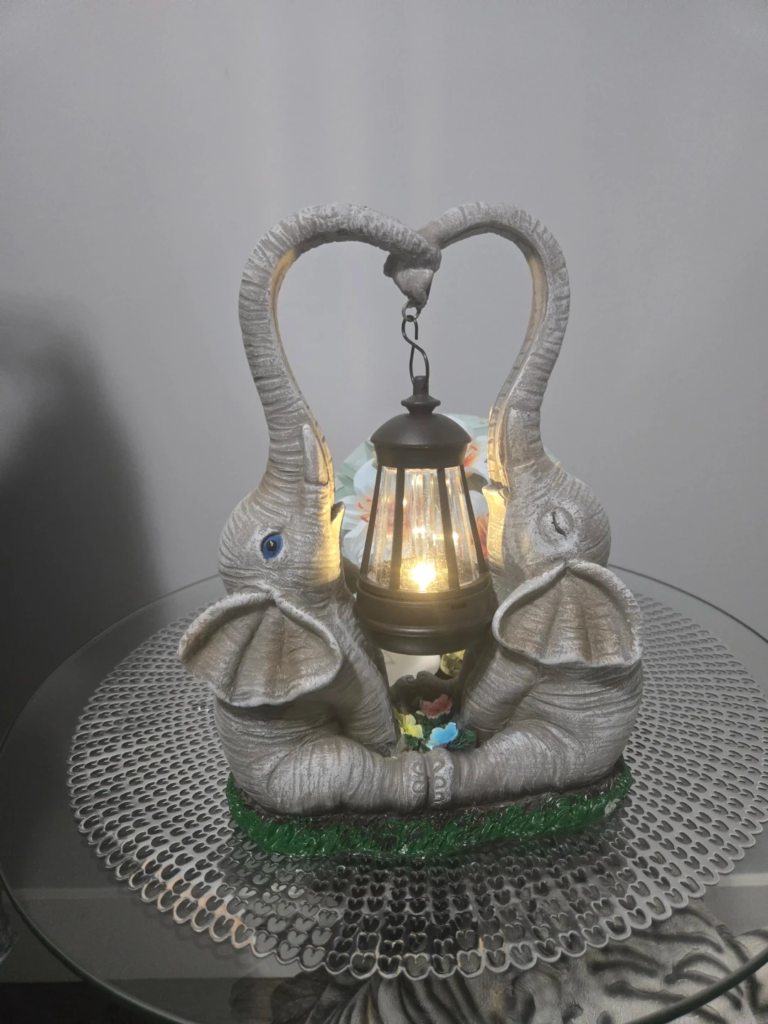 This adorable elephant couple table lamp is sure to add a touch of whimsy to any room! It features two elephants holding a lantern, creating a warm and inviting glow. Perfect for a bedside table, shelf, or any space that needs a little extra charm
