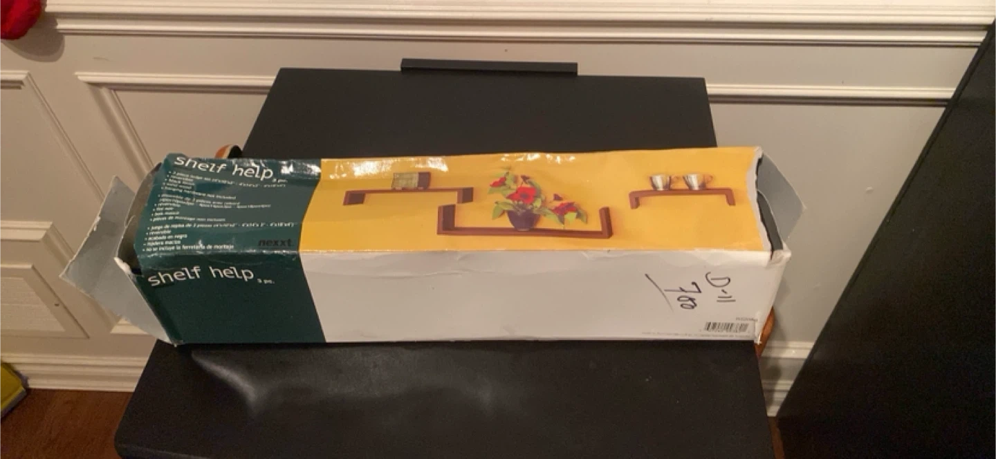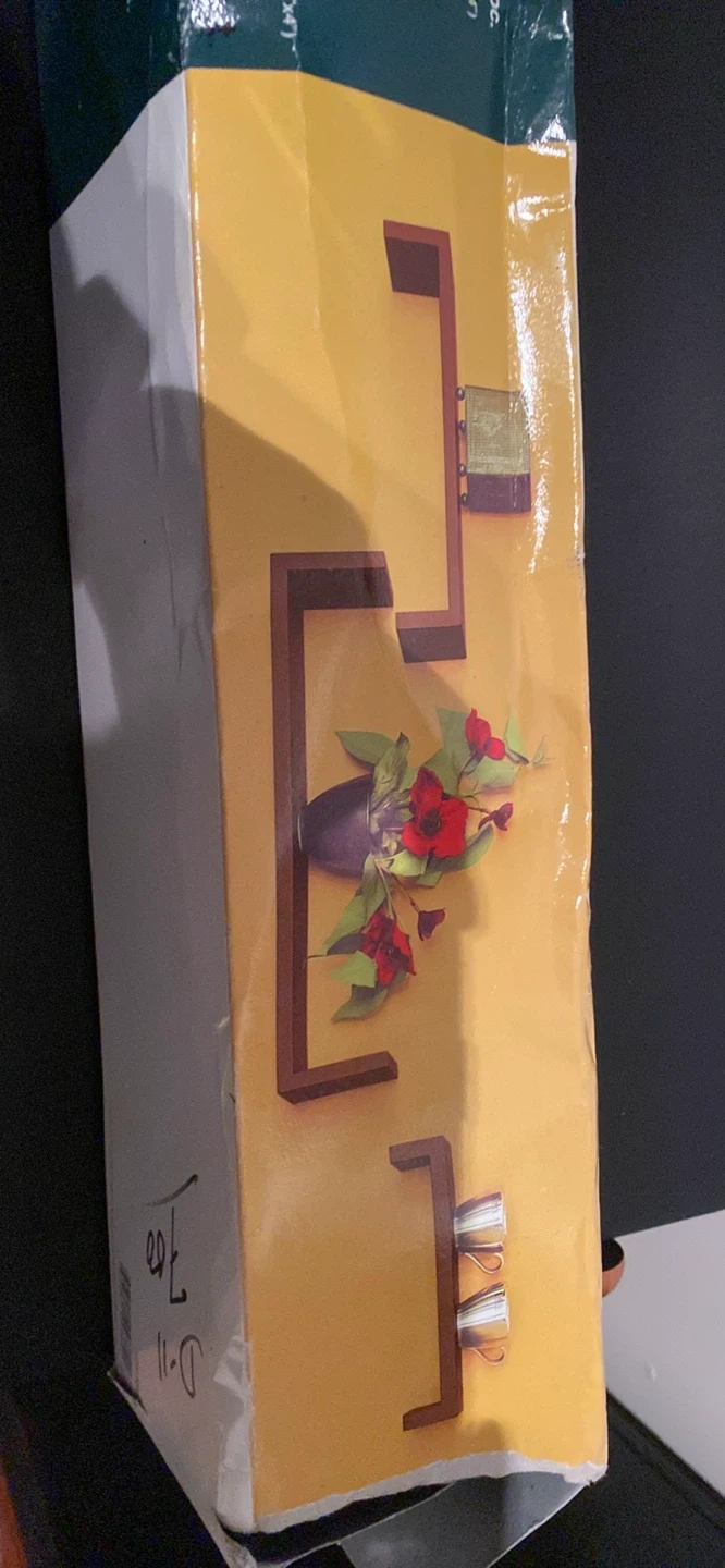 Box is a little messed up no damage but never used I got just found it in my basement and I don’t have any use for it. For any extra info please see picture NO. 3. Good condition it’s a wall shelf. Great for having extra storage in your living room or bedroom.