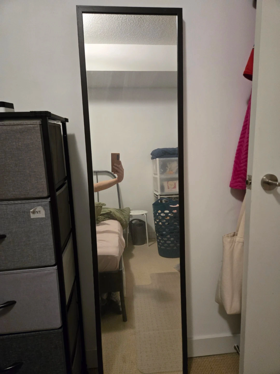 Selling a full-length mirror with a sleek black frame. It's in great shape and ready to brighten up your space! (Beside from dust it has collected for being stuck in storage)