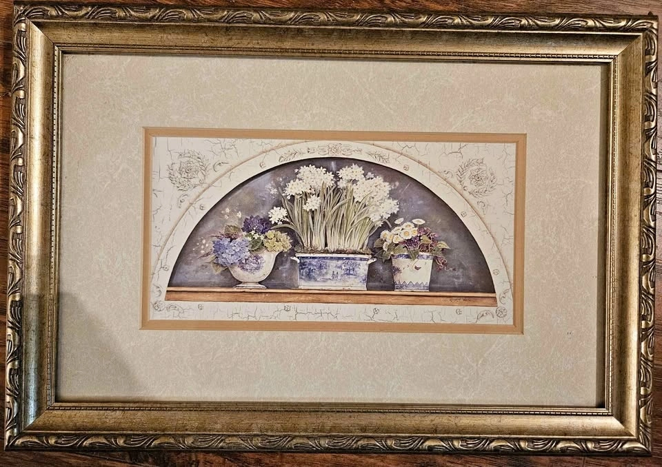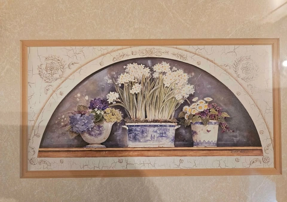 Beautiful framed flower painting by Kathryn White. The artwork has a gold frame with a cream mat and depicts three vases with flowers. Signed by the artist. Approx 11"×14". Pick up near Guildford Mall.