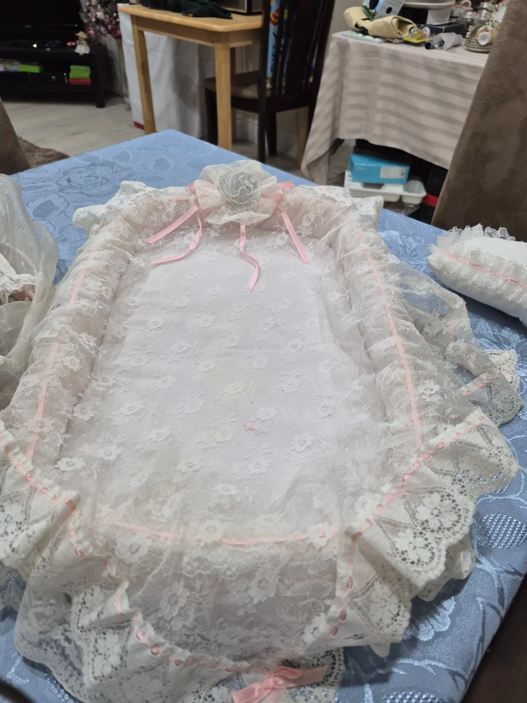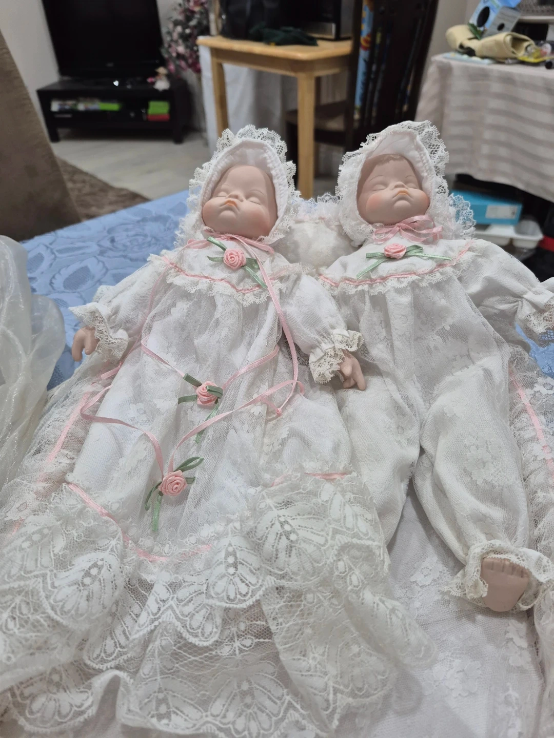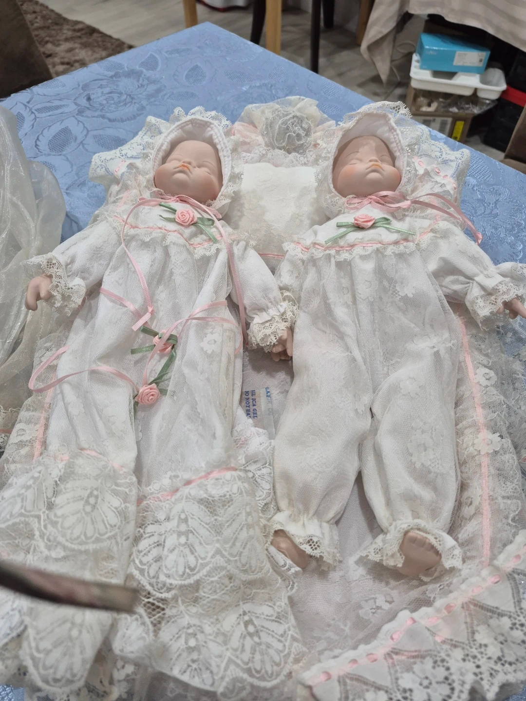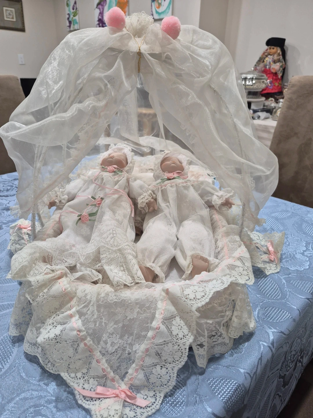 These adorable twin dolls are nestled in a lovely bassinet with a delicate canopy. They're dressed in white lace outfits with pink ribbon accents. Perfect for a collector or as a charming addition to a nursery!