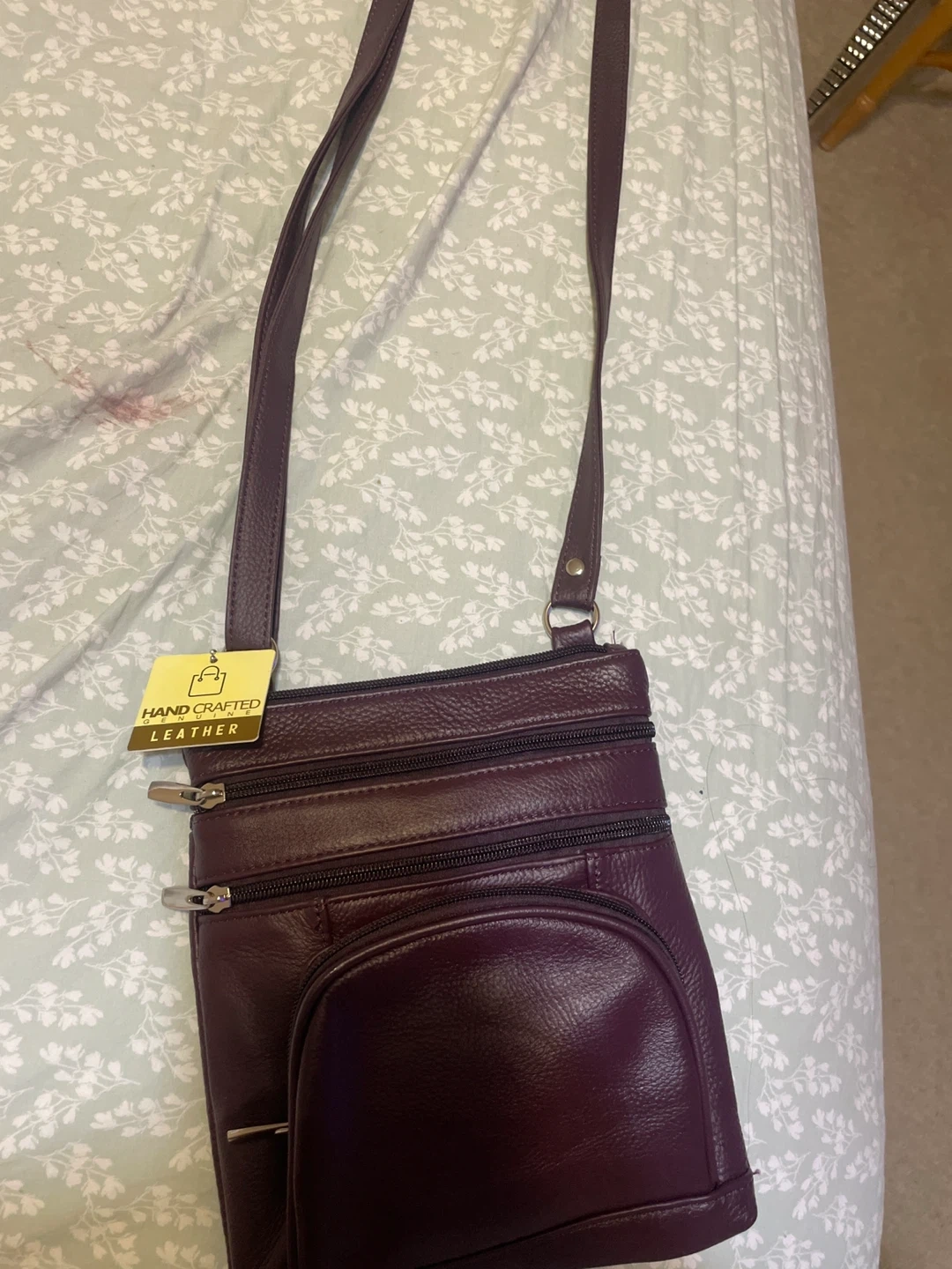This is a hand crafted genuine leather crossbody bag in a lovely purple colour! It features multiple zippered compartments to keep your belongings organized. Perfect for everyday use!