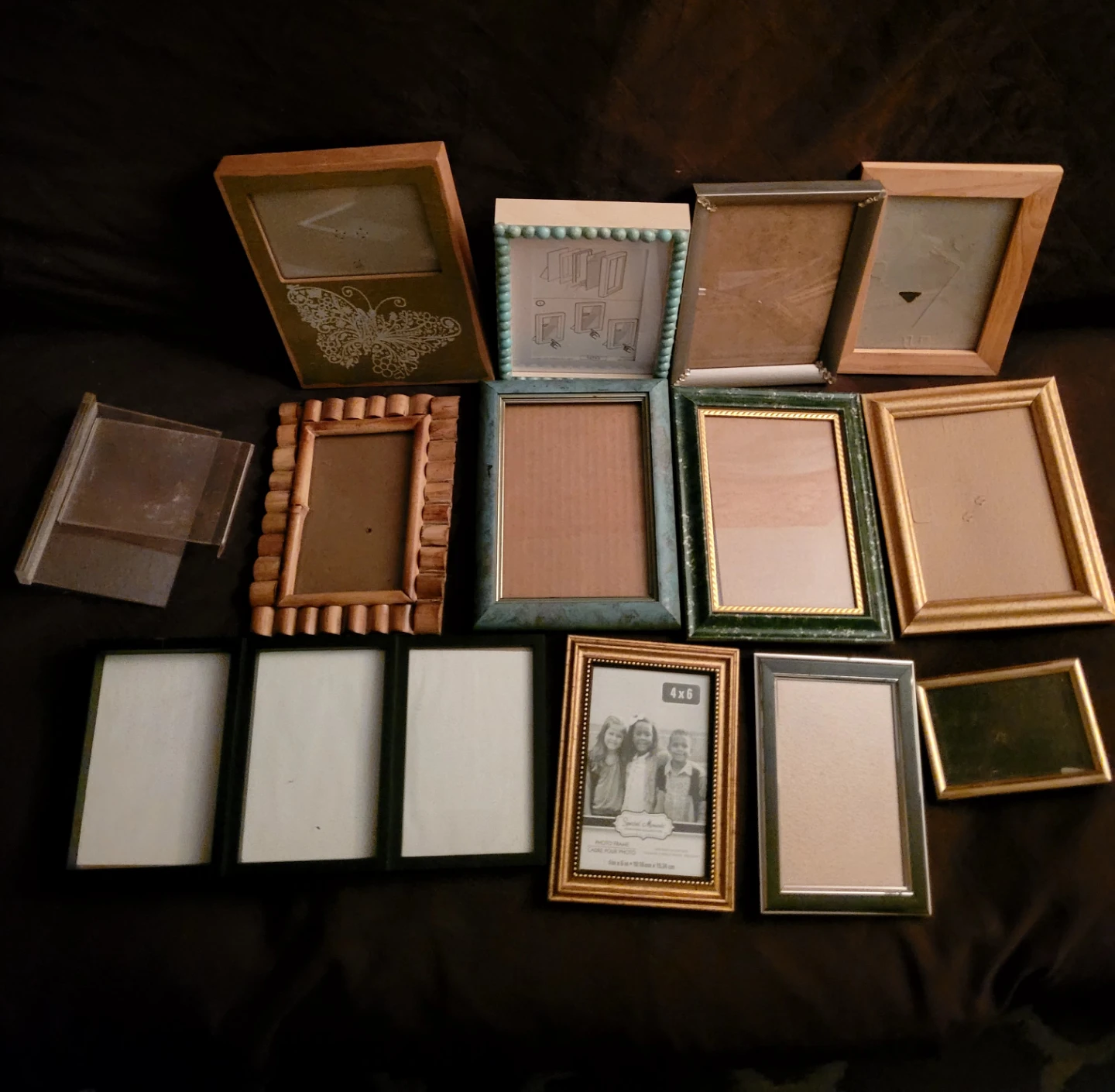 I'm giving away a collection of assorted picture frames in various styles and colours. There are about 11 frames in total, perfect for displaying your favourite photos or artwork. A few different sizes are included, such as 4x6. They are in good condition and ready to be used in your home!
