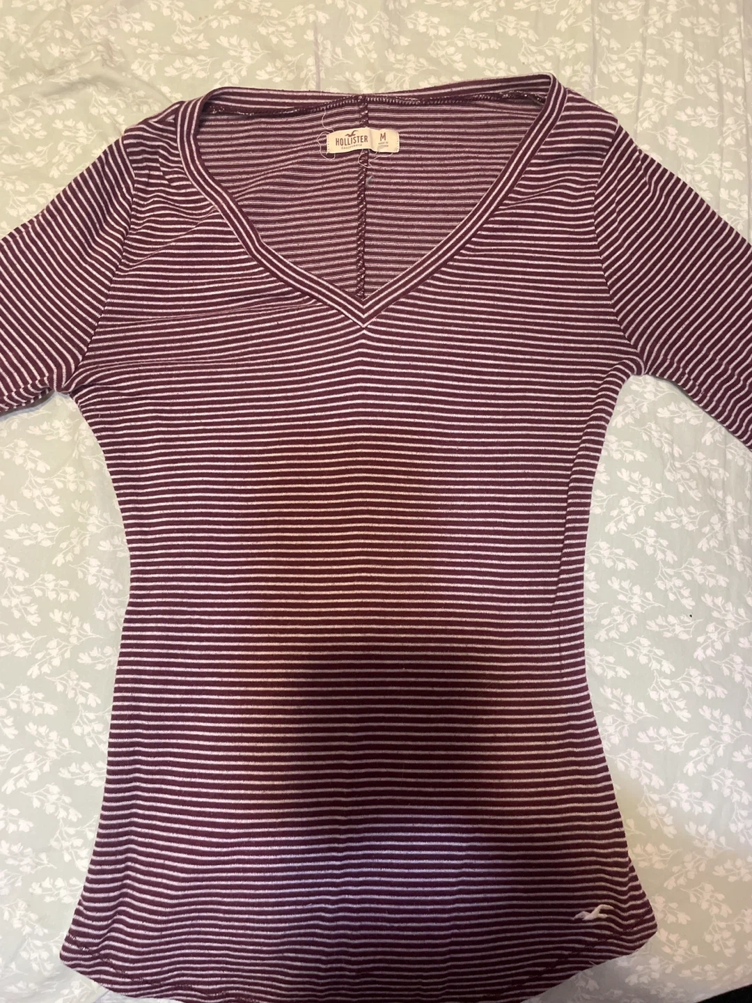 Selling a Hollister striped V-neck top in size medium. It's in good condition and has a nice, fitted look. The stripes are a lovely burgundy colour, perfect for adding a bit of colour to your wardrobe!