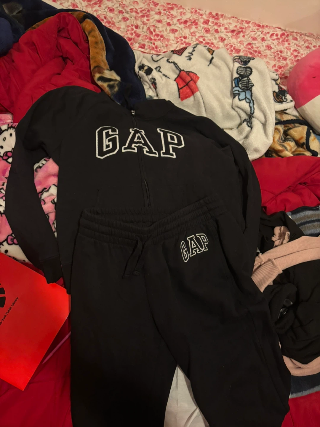 Selling a GAP tracksuit set in black. It includes a zip-up hoodie and matching sweatpants. Perfect for lounging or running errands!