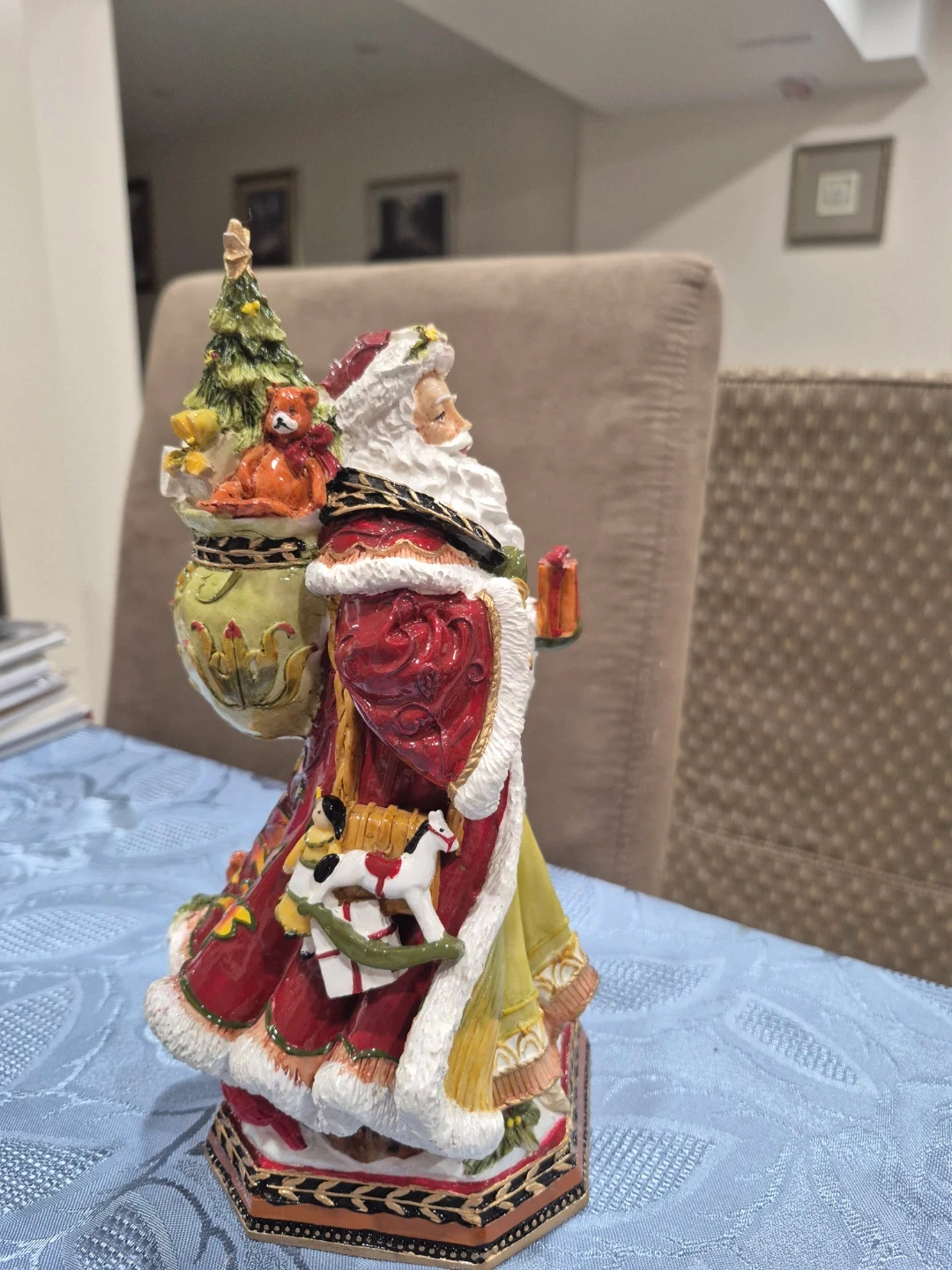 Selling a Santa Claus figurine, perfect for adding some holiday cheer! It's in great condition and features Santa holding a gift and carrying a sack filled with toys and a Christmas tree. The details are quite charming, from the patterned robe to the little rocking horse. It would make a lovely addition to any festive display