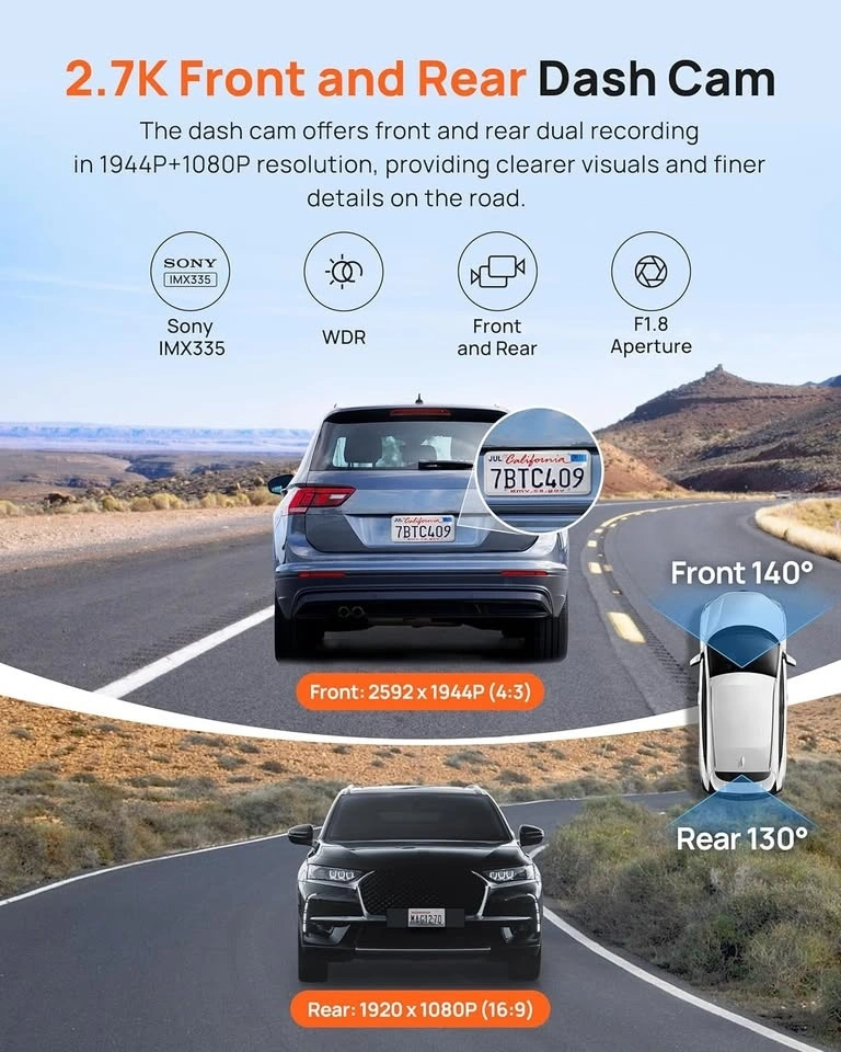 70mai 2.7K Dash Cam Front and Rear A500S, 1944P UHD Dashcam for Cars, ADAS, Built in WiFi GPS, Sony IMX335, 2'' IPS LCD Screen, 140° FOV, WDR, Super Night Vision, 24-Hour Parking Mode, Time-Lapse