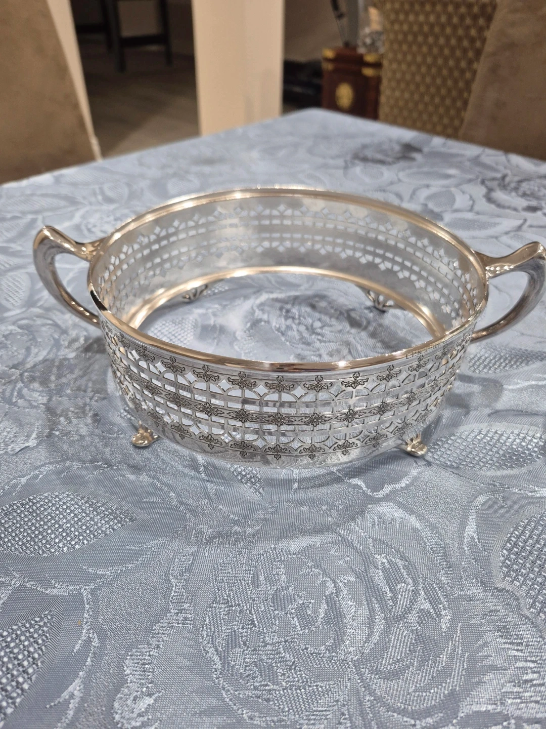 Selling a lovely vintage serving dish with a silver-plated frame and a clear glass bowl and lid. It's in great condition and would add a touch of elegance to any table setting!