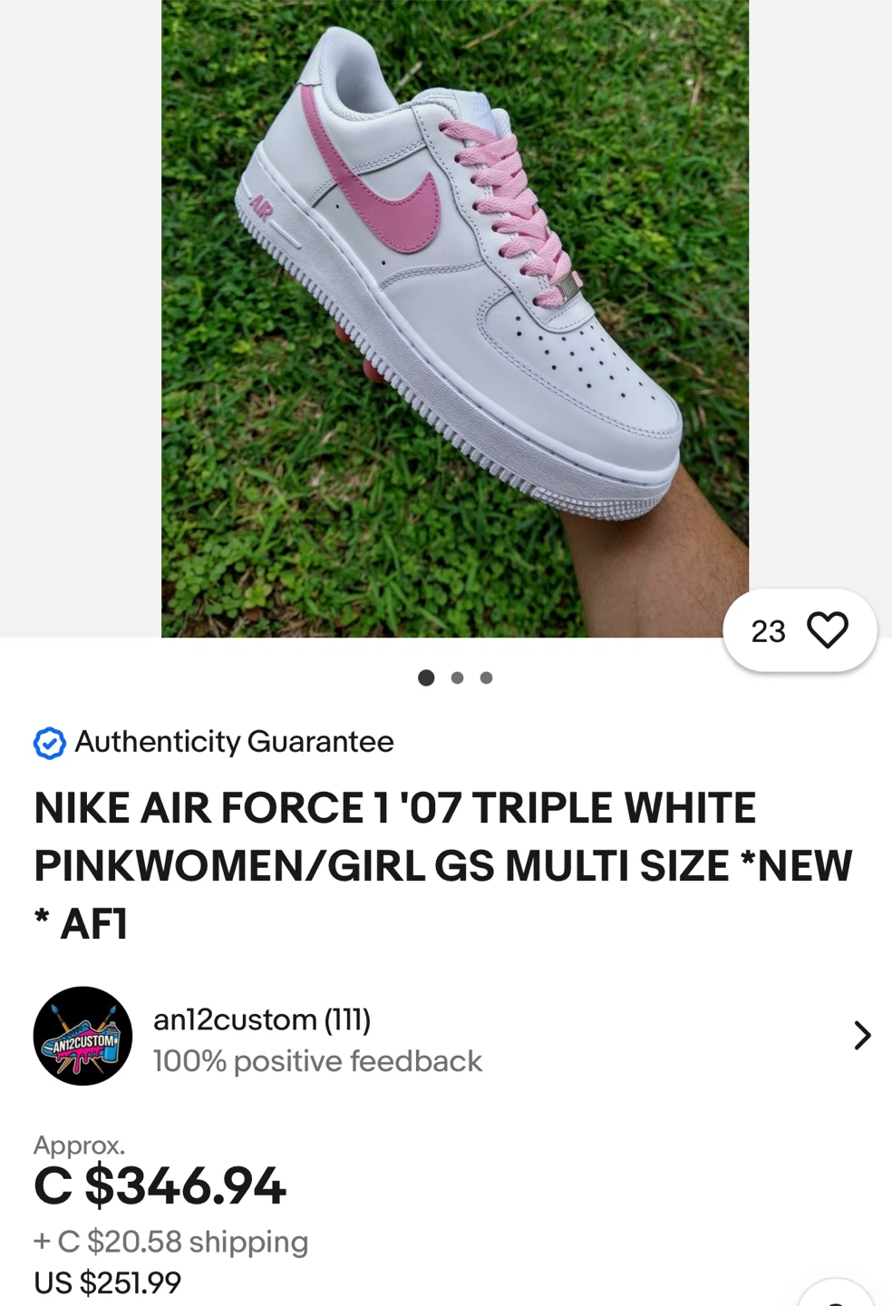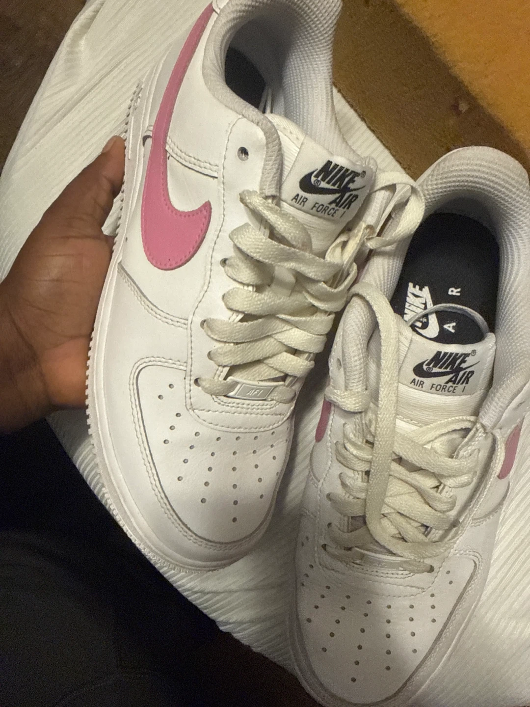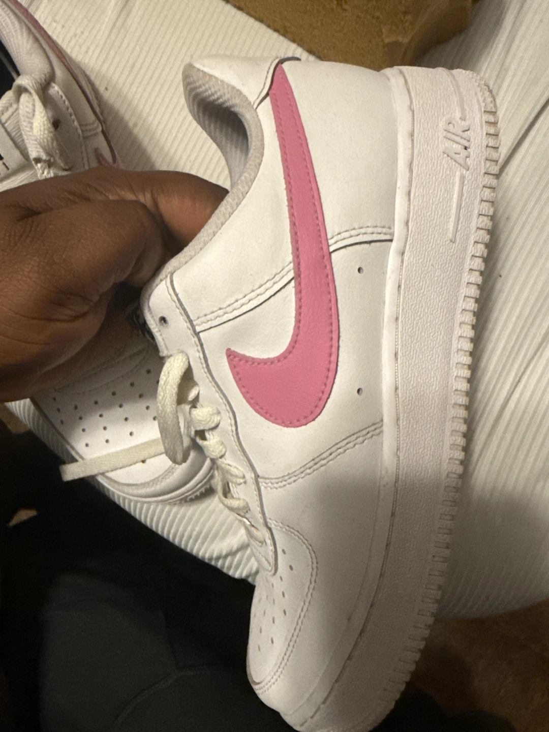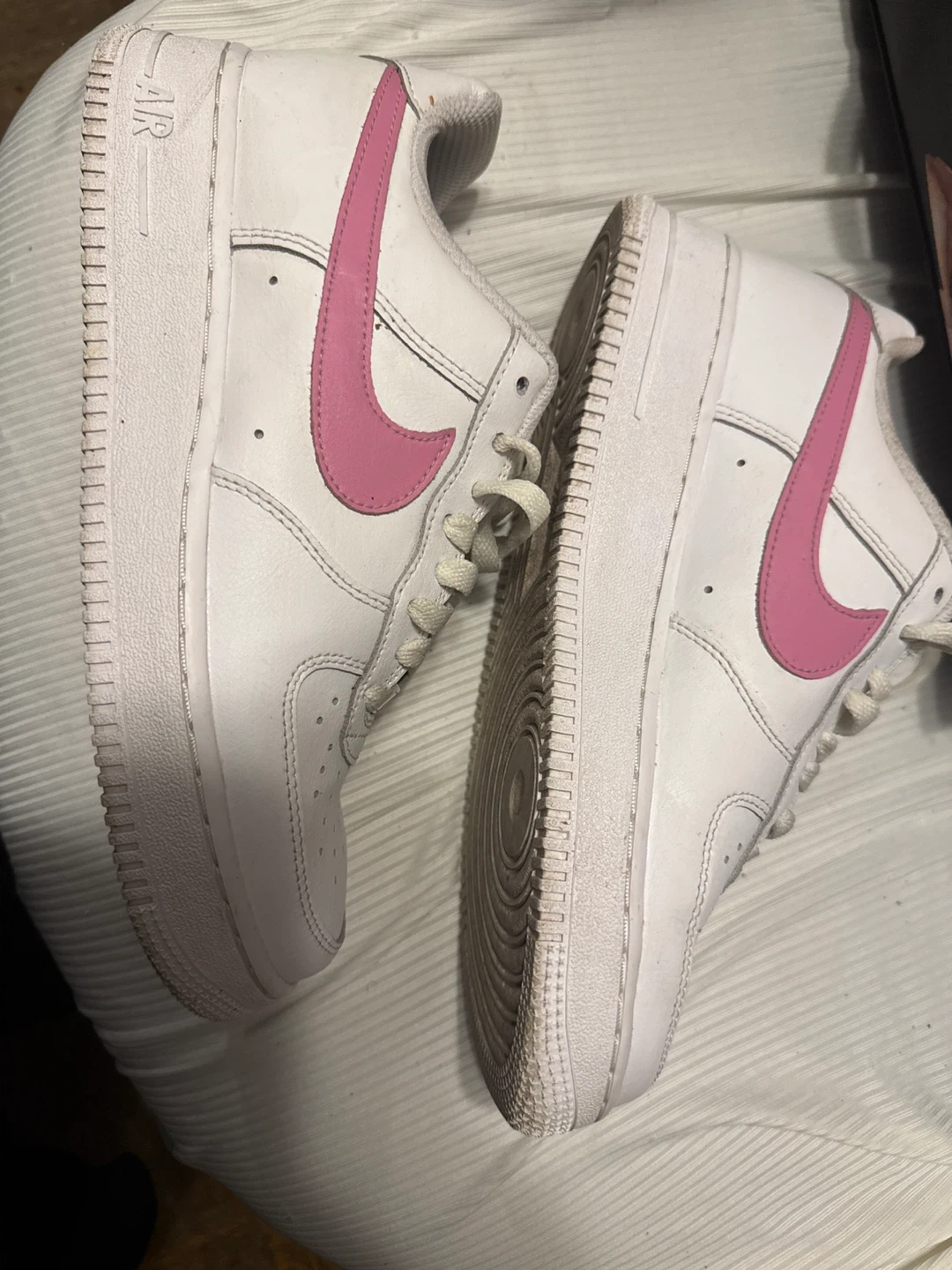 Selling a pair of Nike Air Force 1 '07 in Triple White with a pink swoosh! They're in good condition and ready for a new owner. A classic and stylish shoe that goes with everything. I added the original price that I bought it.