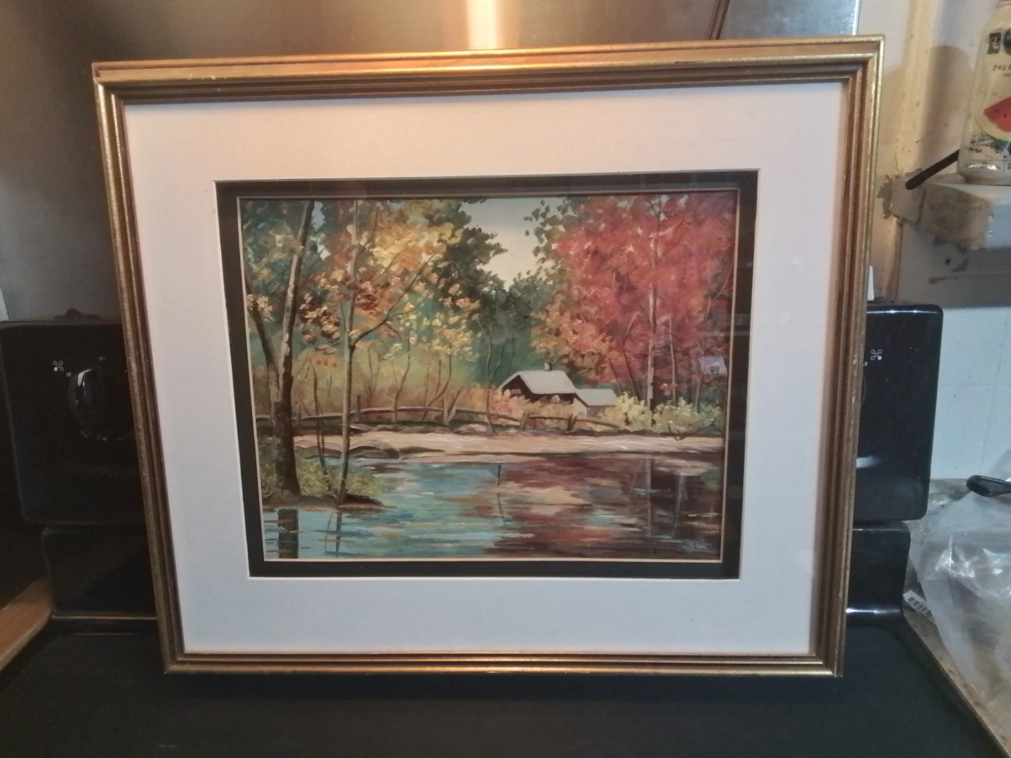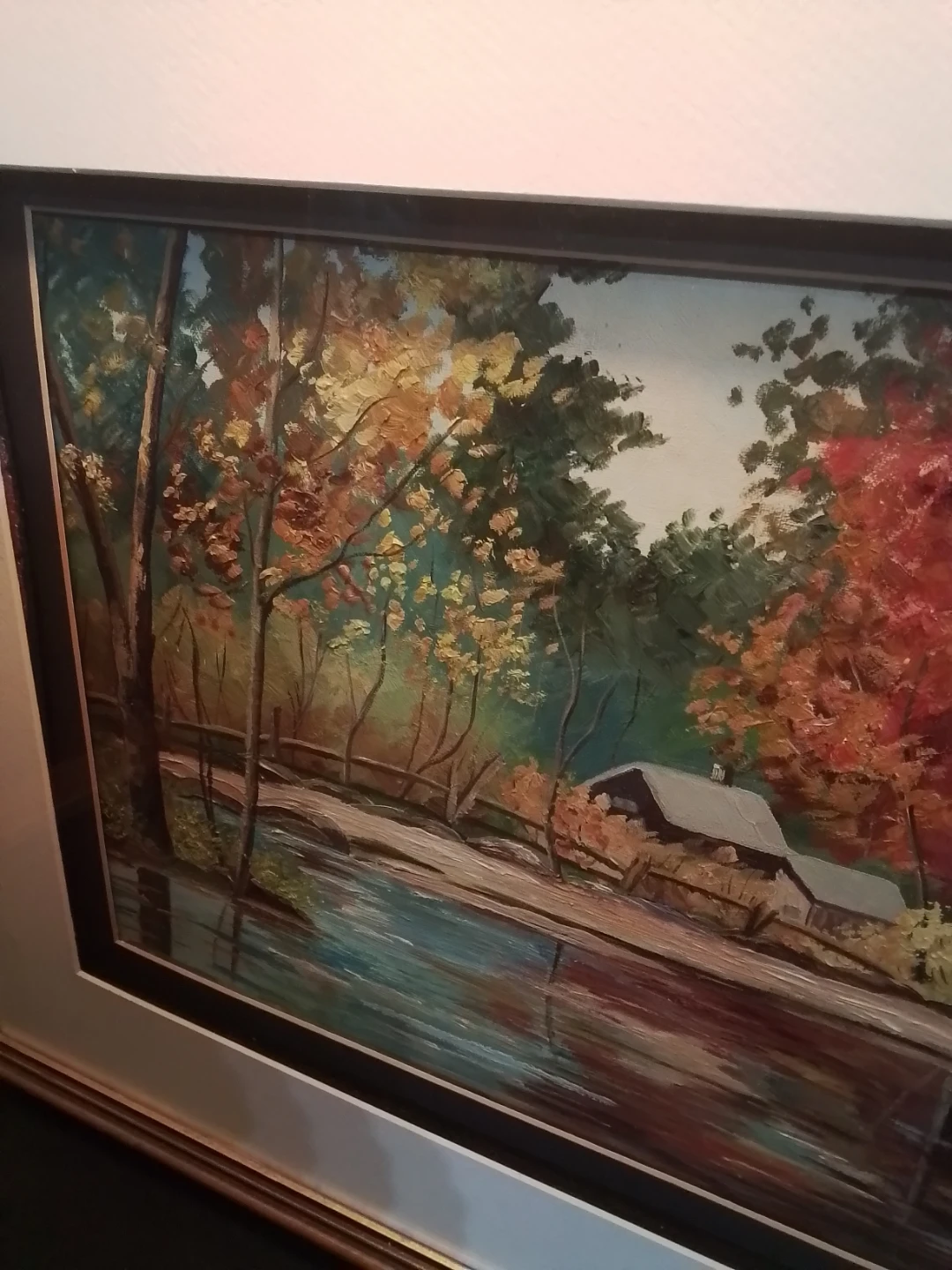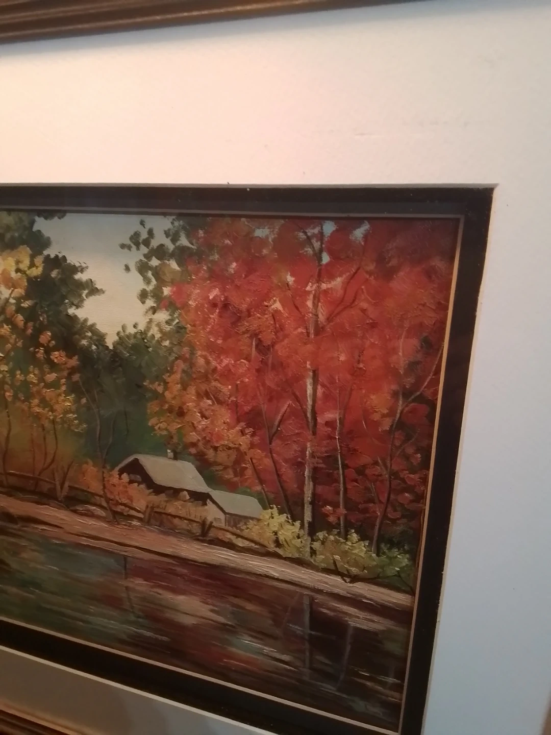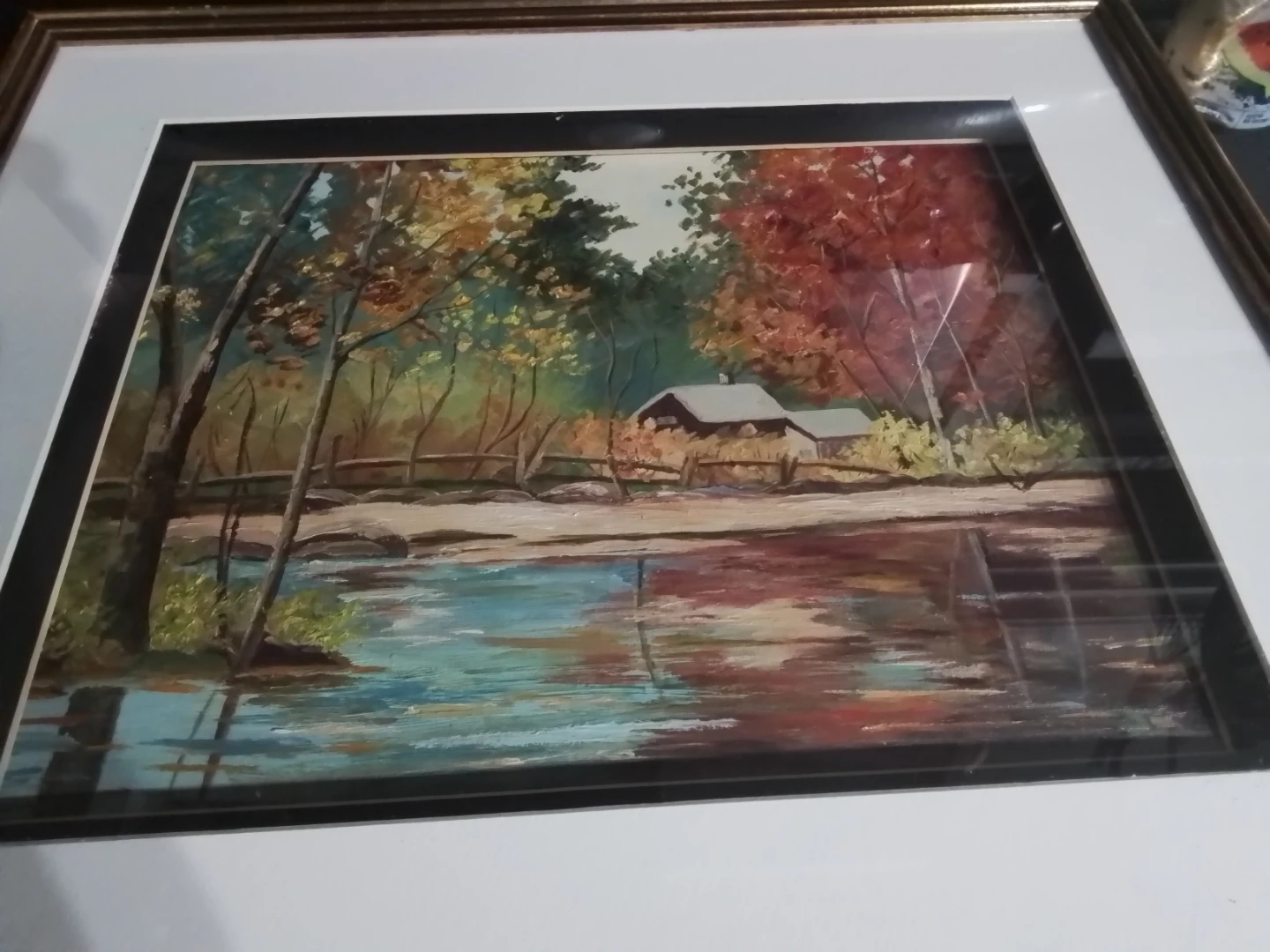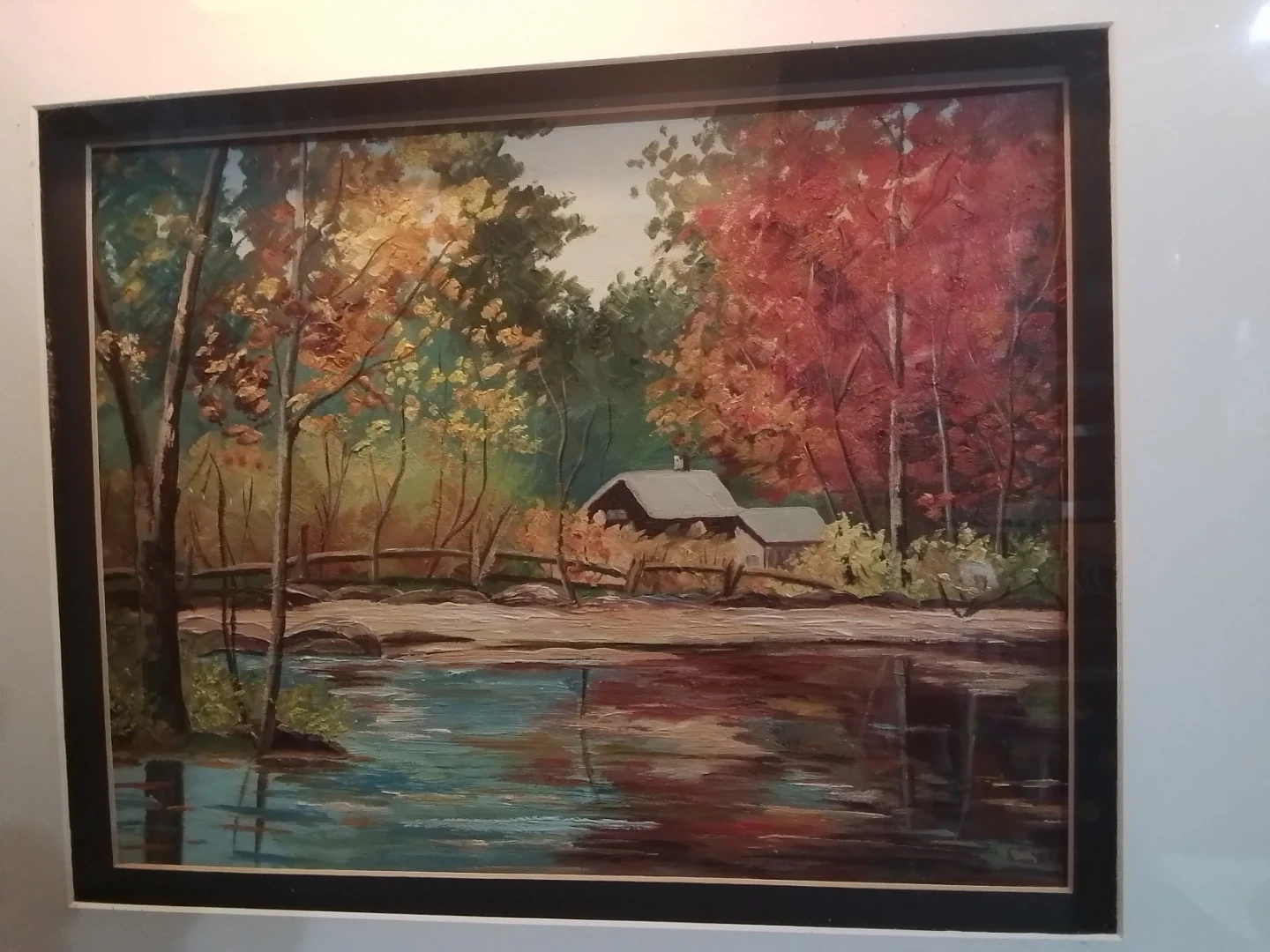 This is an oil painting in a shadow frame, sized at 21x18.25 inches including the mat, depicting a serene landscape with a cabin by a lake surrounded by autumnal trees. It's a previously owned piece that brings a touch of nature's tranquility to any room. I have enjoyed it for a while and thought I would find it a new home.