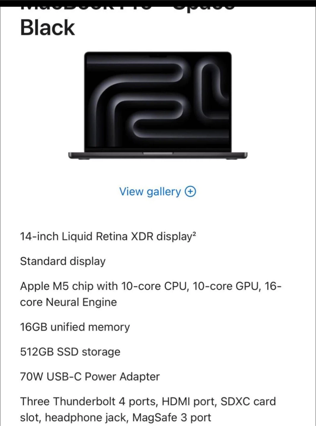 Selling a MacBook Pro in Space Black! It has the Apple M5 chip with a 10-core CPU, 10-core GPU, and a 16-core Neural Engine.