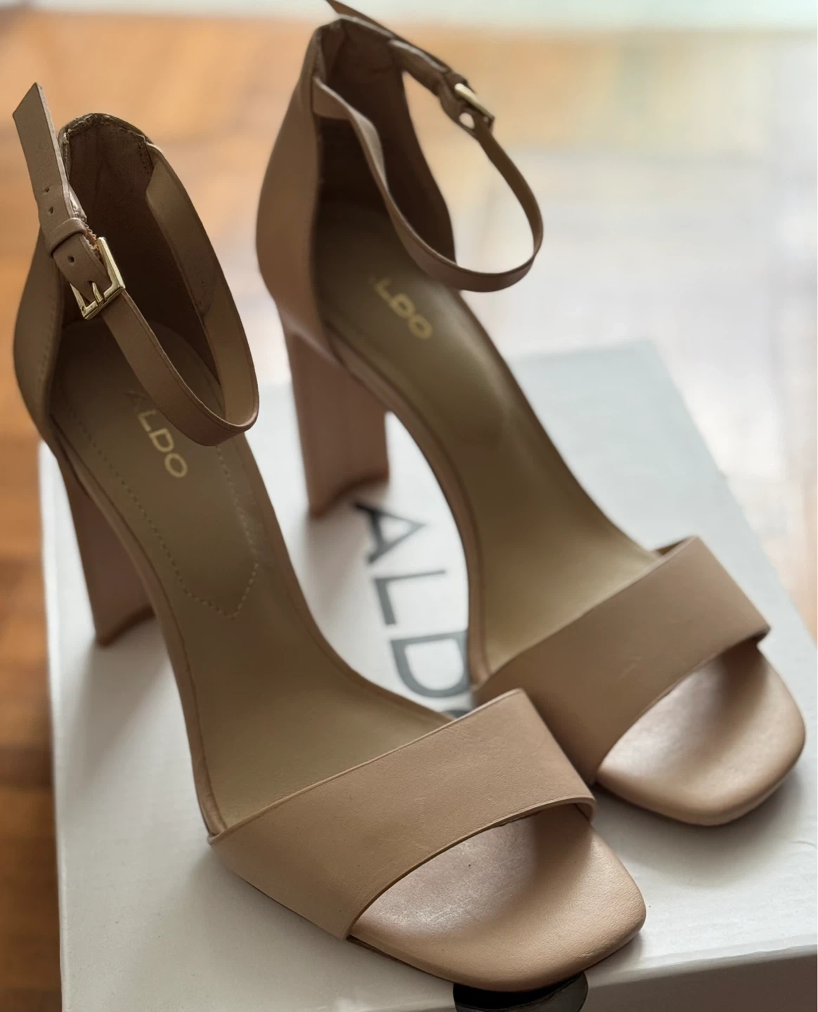 These Aldo heels are a beautiful beige colour and are in great condition! They come in their original box and are a US size 6.5, EUR size 37, and UK size 4