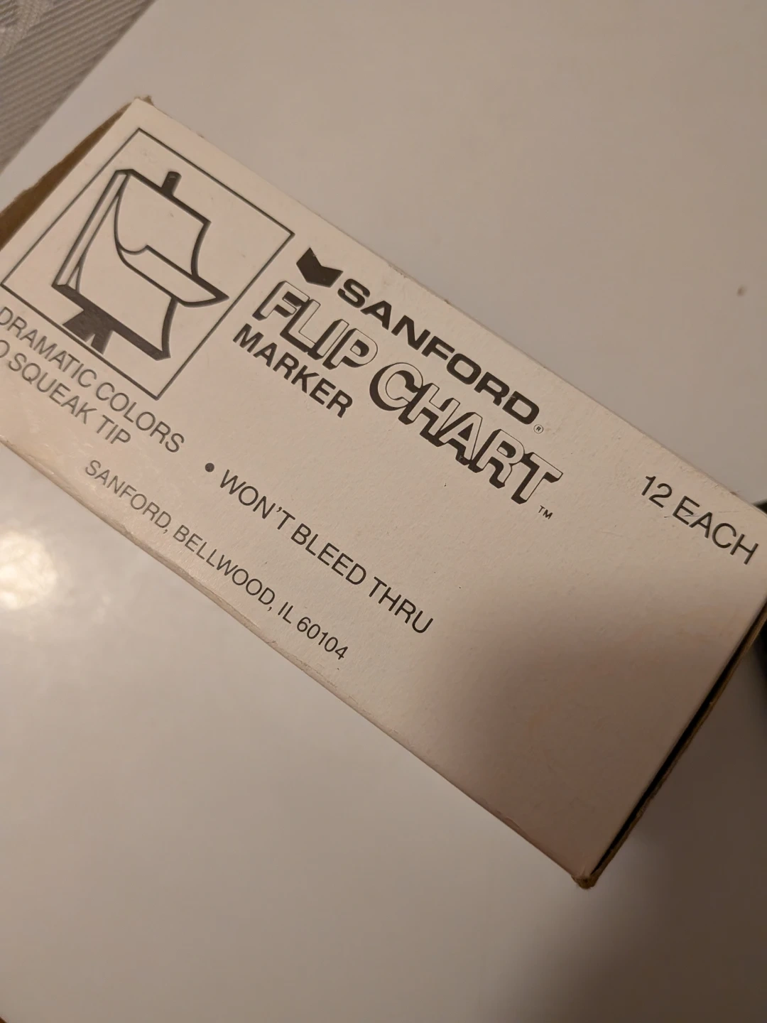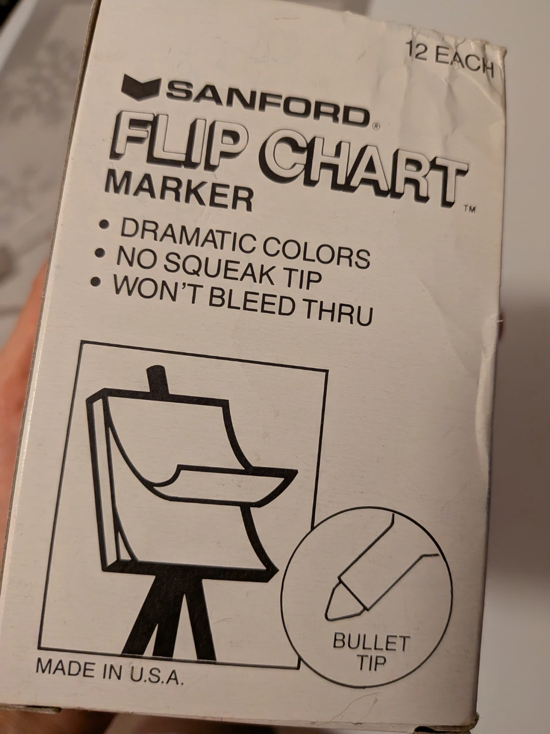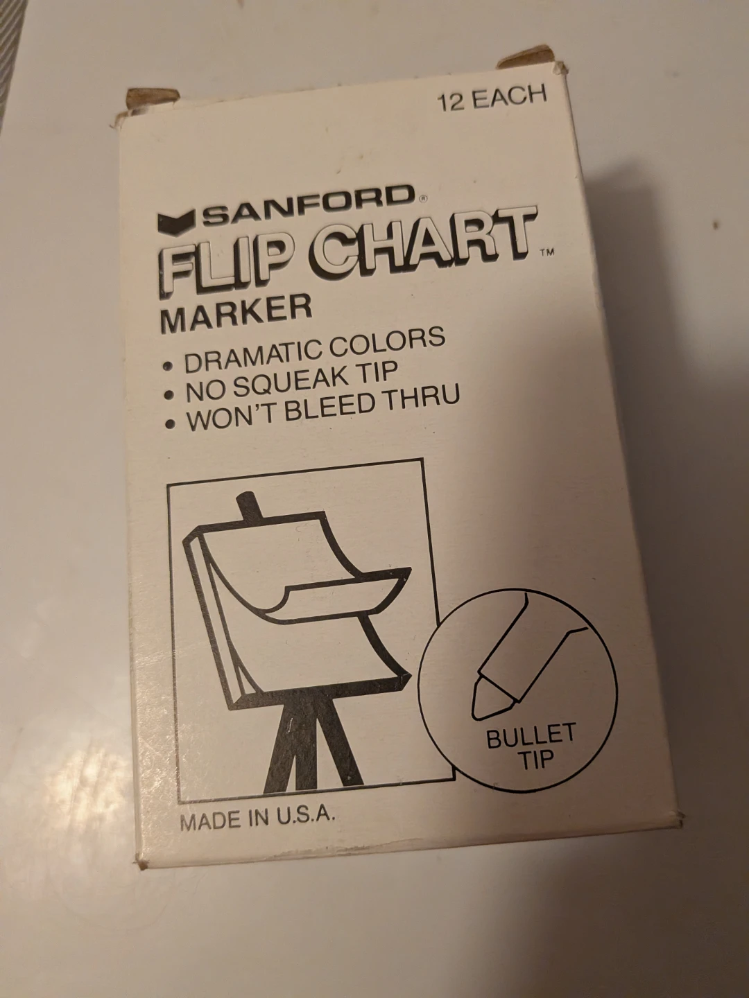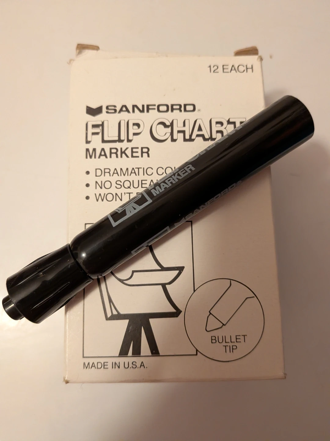 Selling a box of Sanford black Flip Chart Markers! The box includes 10 UNUSED markers with bullet tips (two were used) They have dramatic colours, no squeak tip, and won't bleed through. Great for presentations or brainstorming sessions