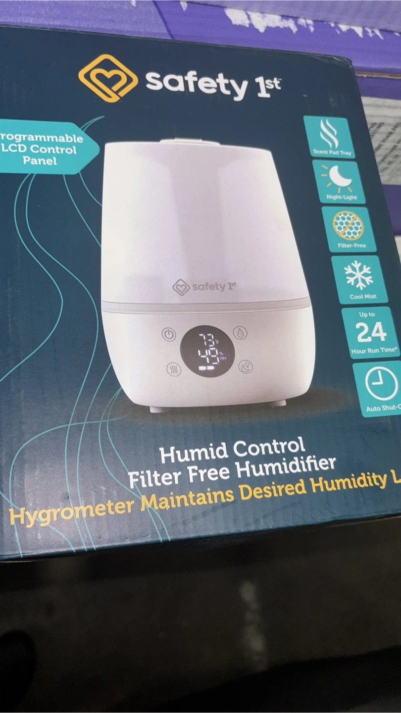 Selling a Safety 1st Humid Control Filter Free Humidifier! It has a programmable LCD control panel, scent pad tray, night-light, cool mist, and auto shut-off. It runs for up to 24 hours. Includes the box, charger, and a Lavender Scent Pad!