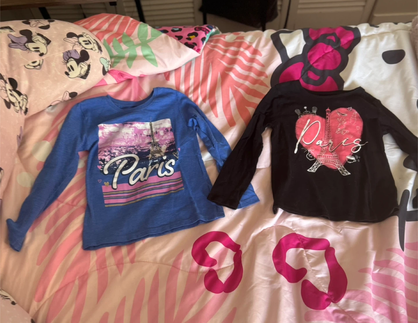 Two cute long-sleeve shirts for girls! One is blue and the other is black, both featuring a Paris-themed design. Perfect for adding a touch of Parisian flair to any outfit.