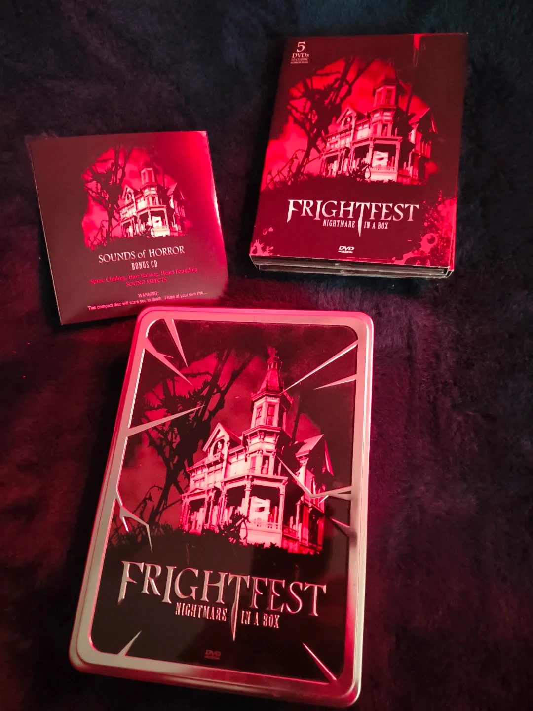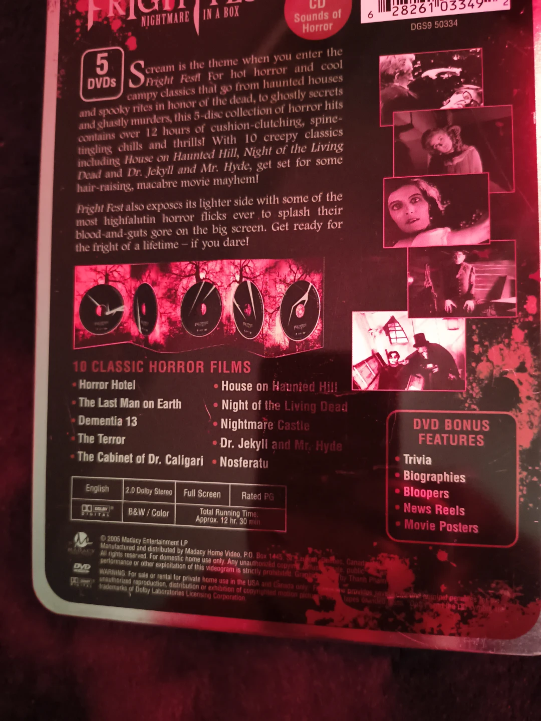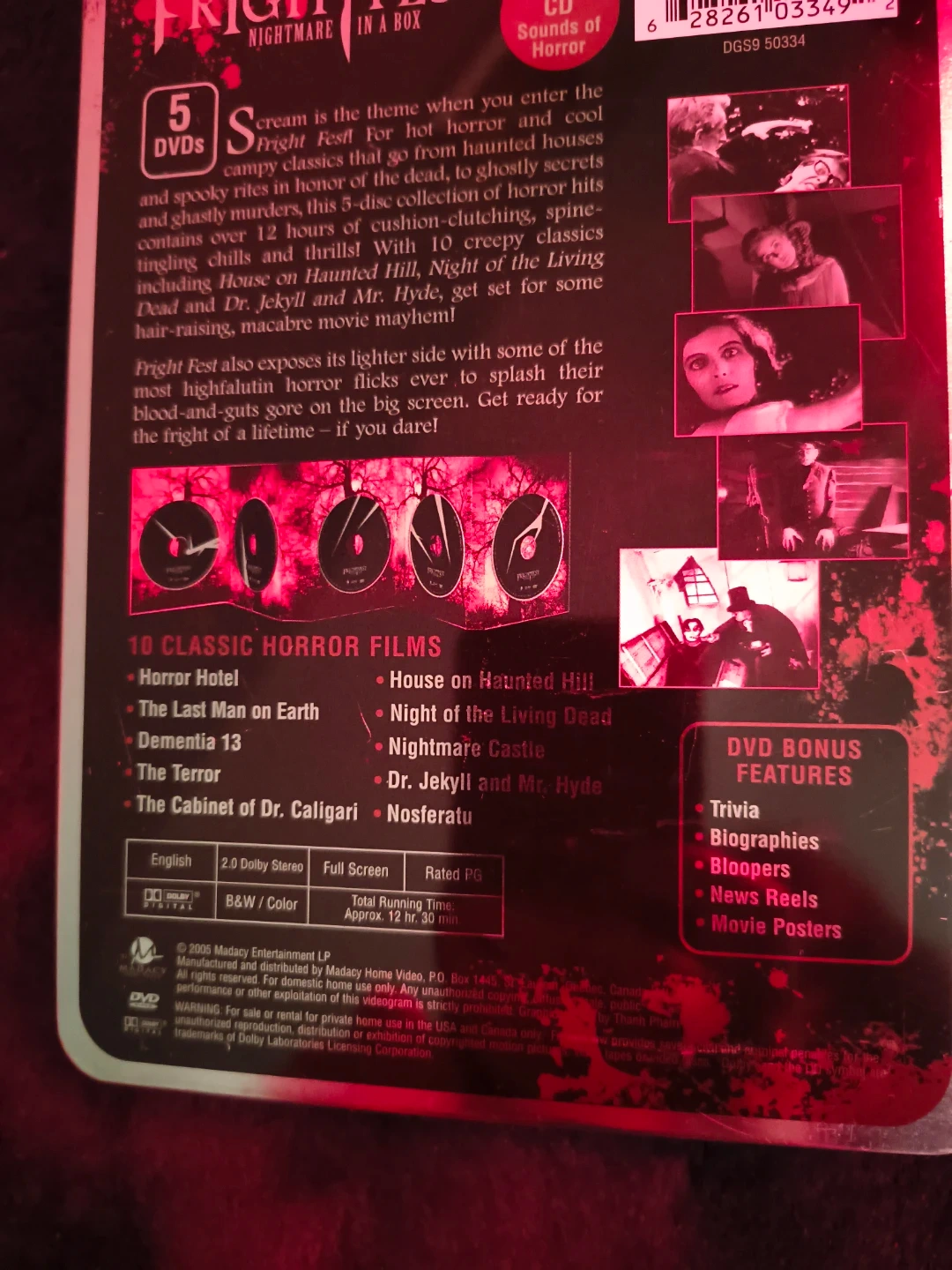 Selling a Frightfest Nightmare in a Box DVD set! It includes 5 DVDs and a Sounds of Horror bonus CD. You'll find 10 classic horror films inside, such as Horror Hotel, The Last Man on Earth, and Night of the Living Dead. Get ready for some spooky nights!