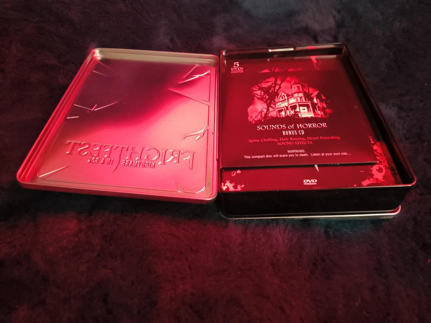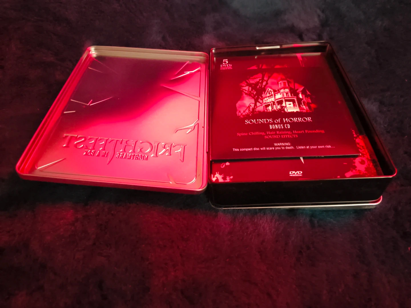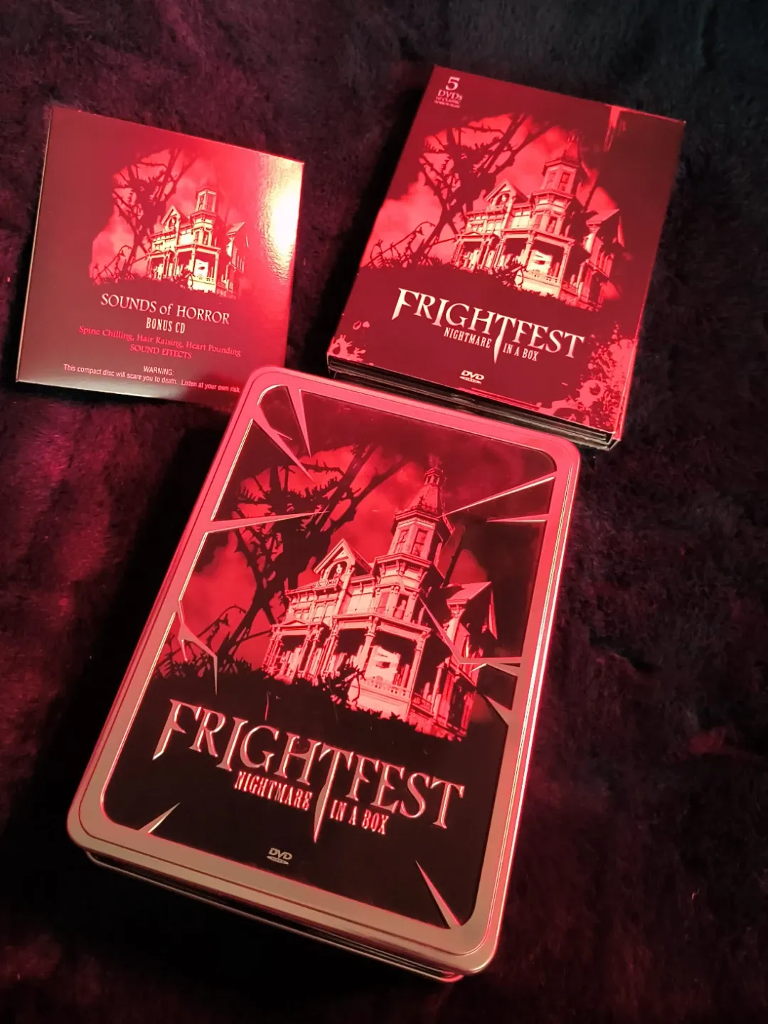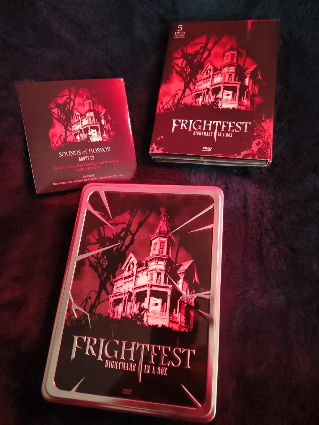 Selling a Frightfest Nightmare in a Box DVD set! It includes 5 DVDs and a Sounds of Horror bonus CD. You'll find 10 classic horror films inside, such as Horror Hotel, The Last Man on Earth, and Night of the Living Dead. Get ready for some spooky nights!