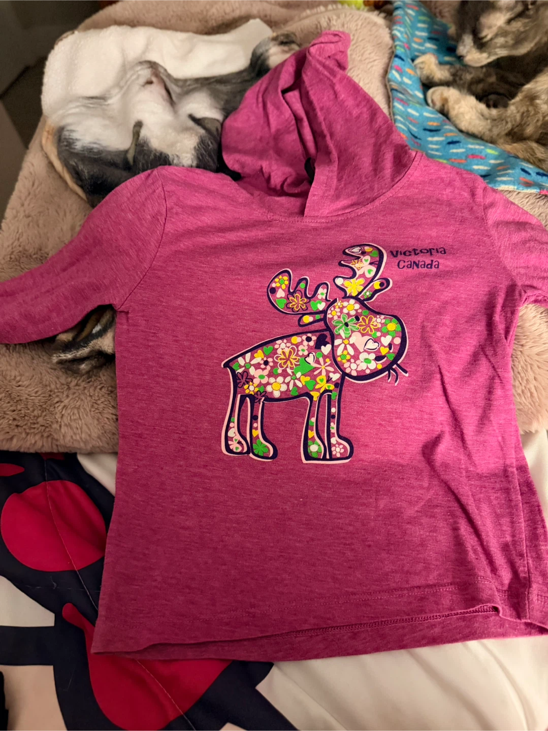 Cute pink hoodie from Victoria Canada! It has a fun floral moose design on the front. Perfect for layering or wearing on its own. Good condition. Size XSmall.