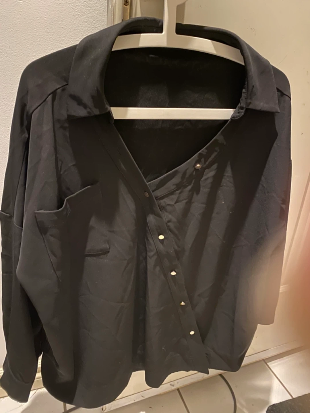 Here's a black button-down shirt! It's in great condition and ready for a new wardrobe. Very unique design. Have 1 black and white available