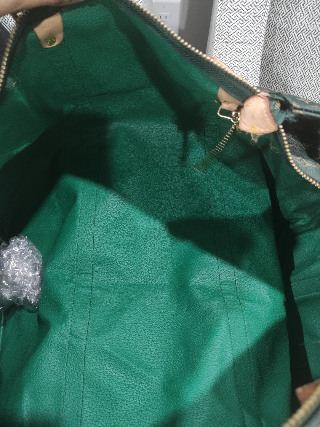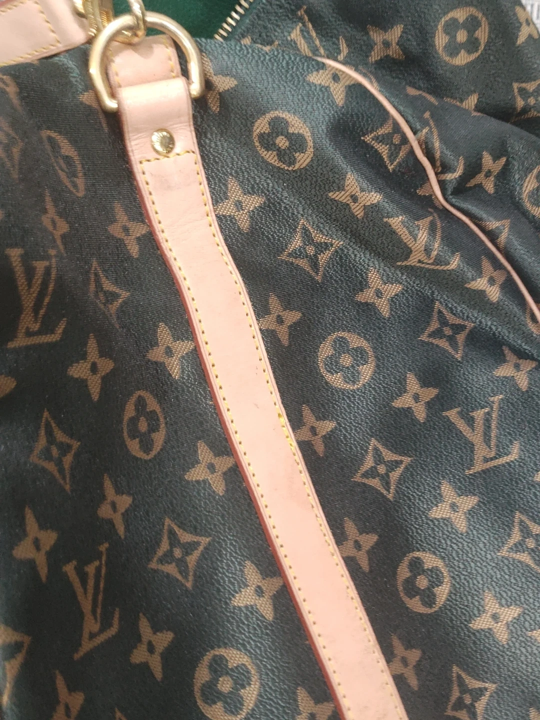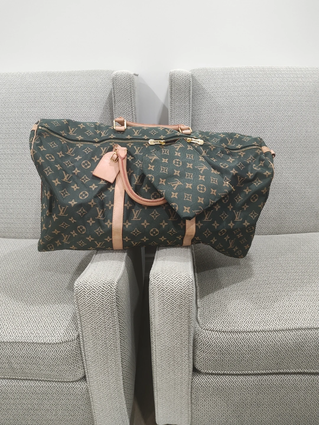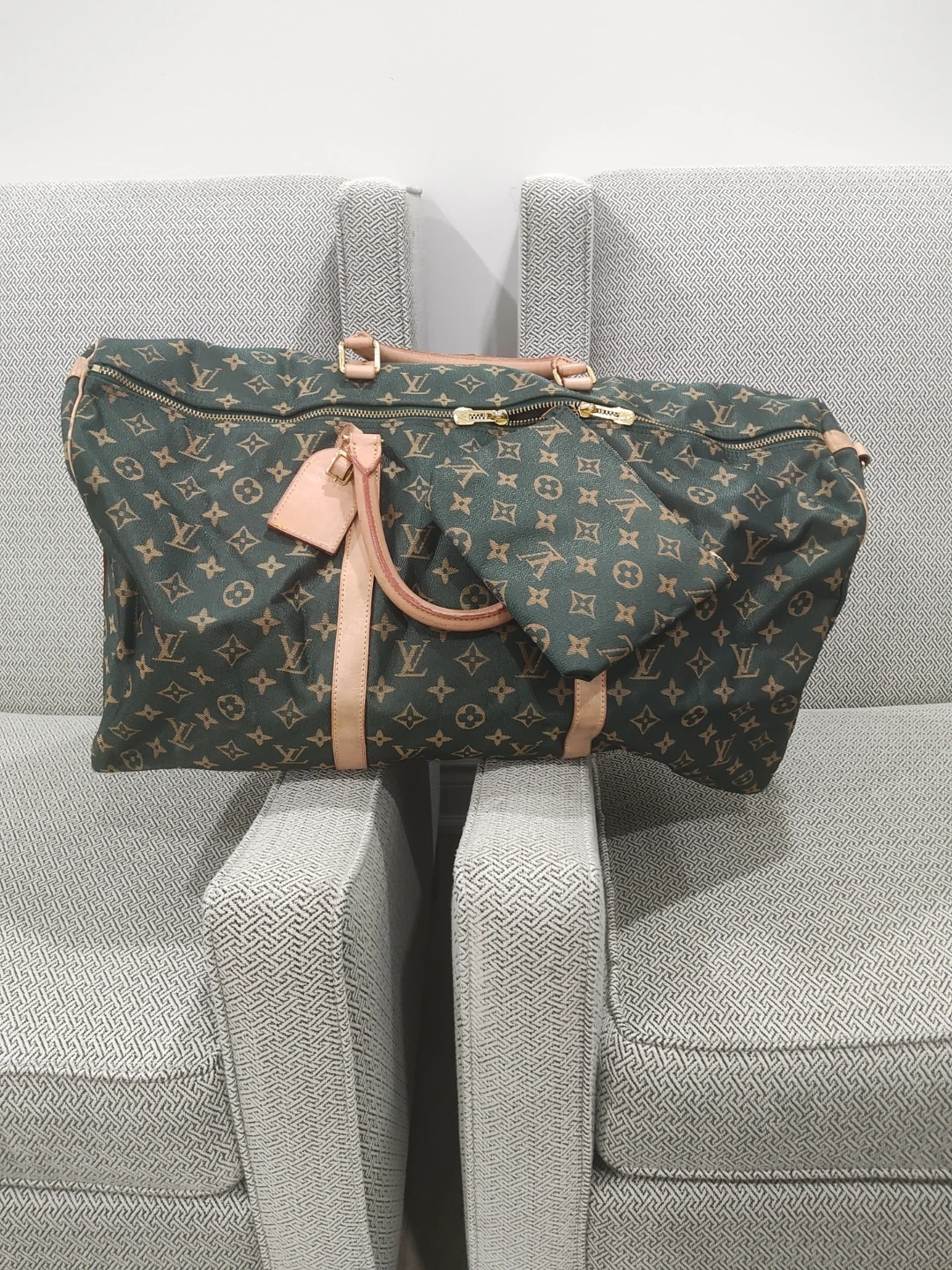 Here's a Louis Vuitton duffel bag with the classic monogram pattern! It's a stylish and spacious option for travel or everyday use. The bag features the iconic LV monogram throughout, with leather accents. It appears to be in good condition with some signs of wear.