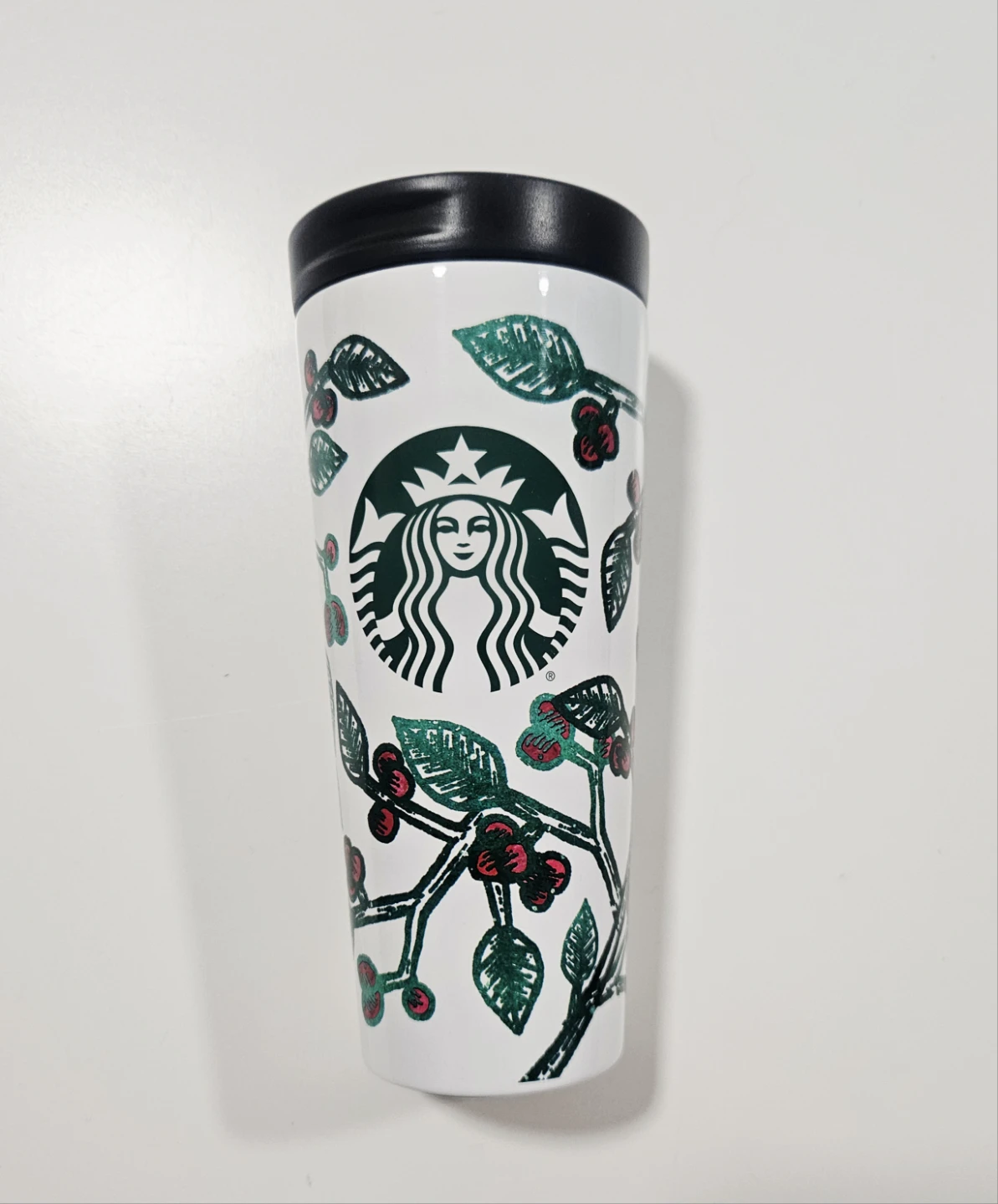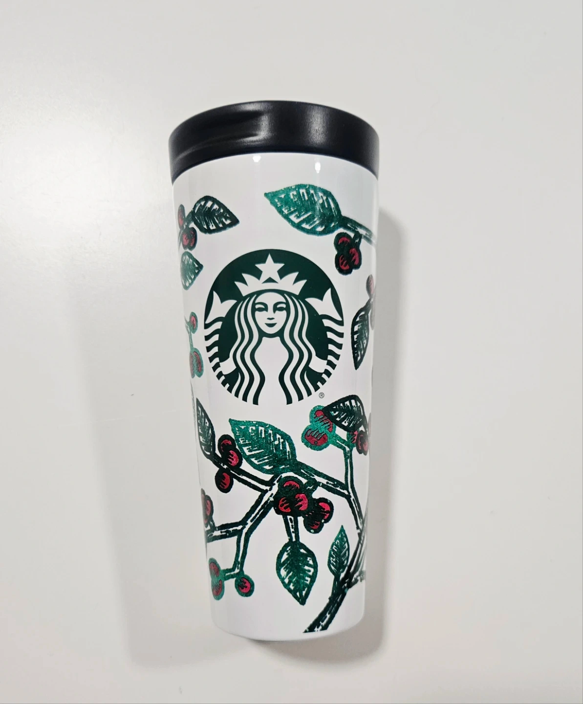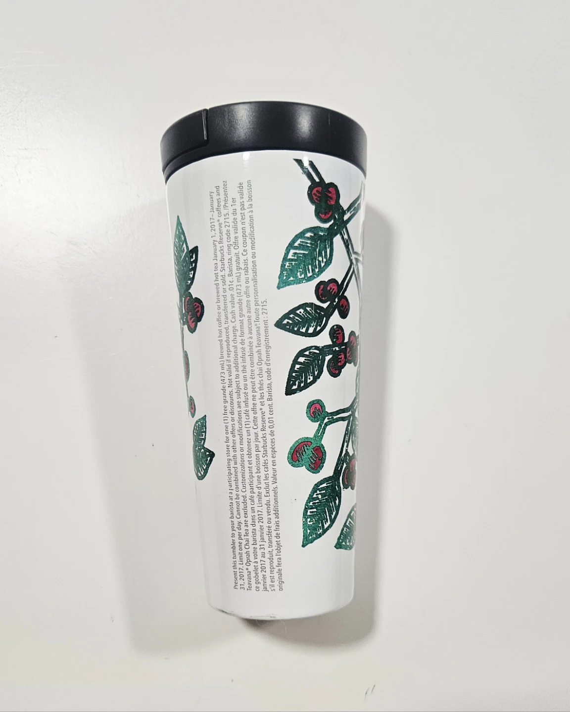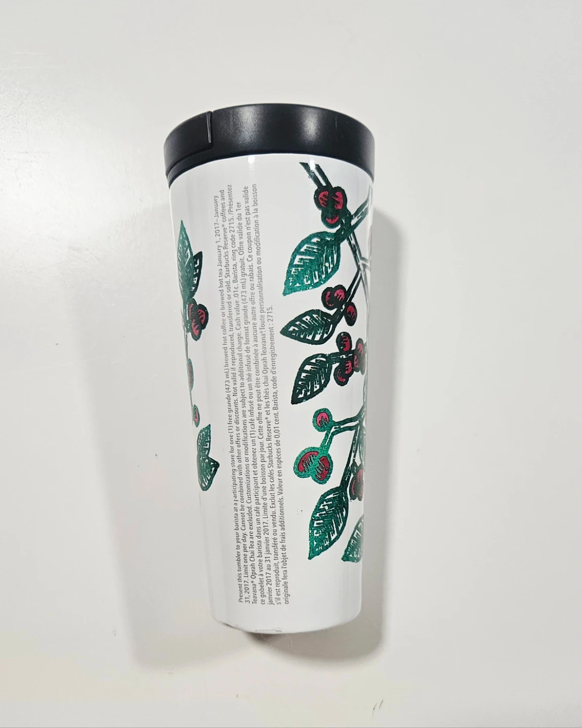 Selling a Starbucks Christmas tumbler in white with a green and red design featuring festive holly berries and leaves.