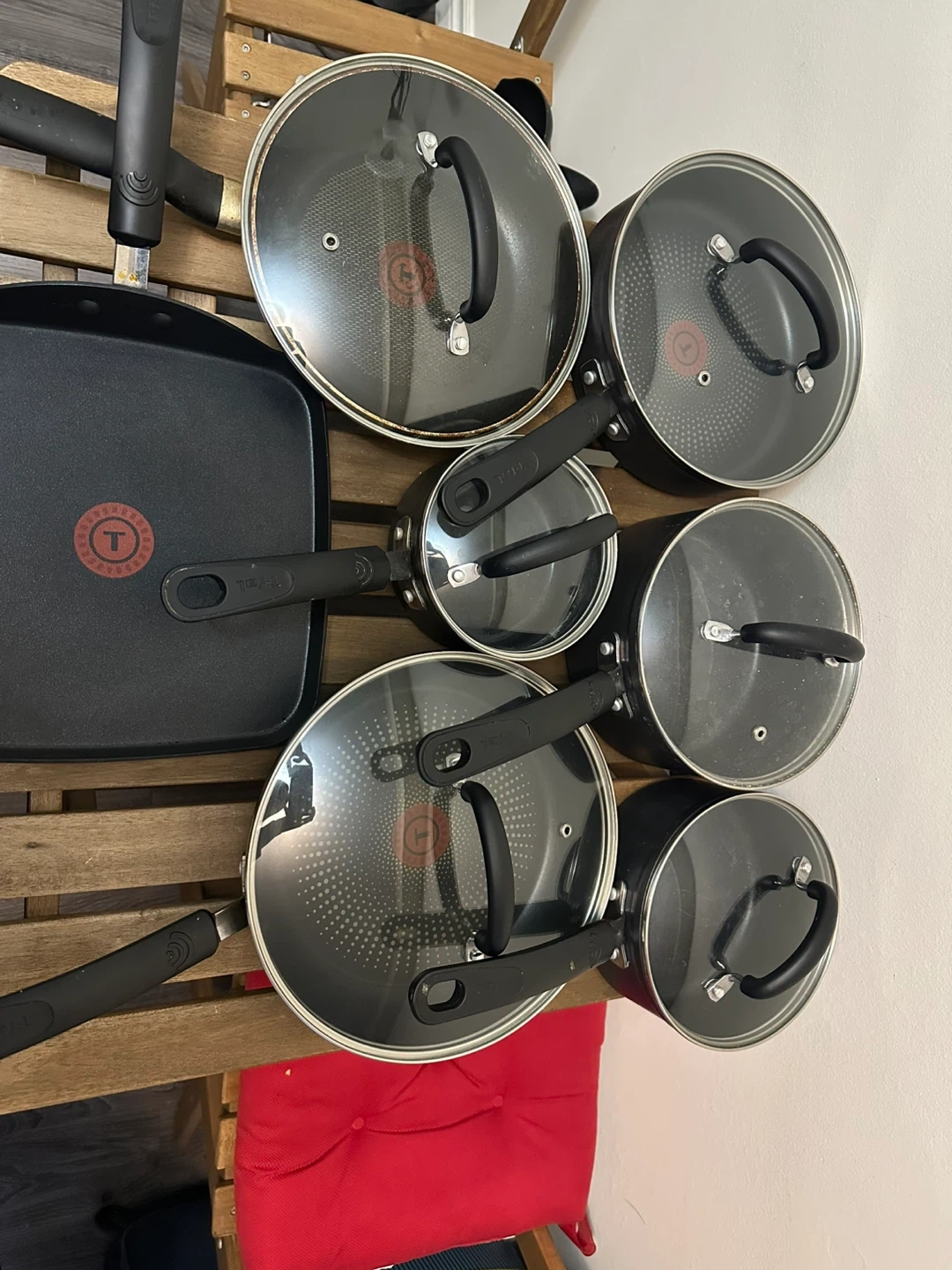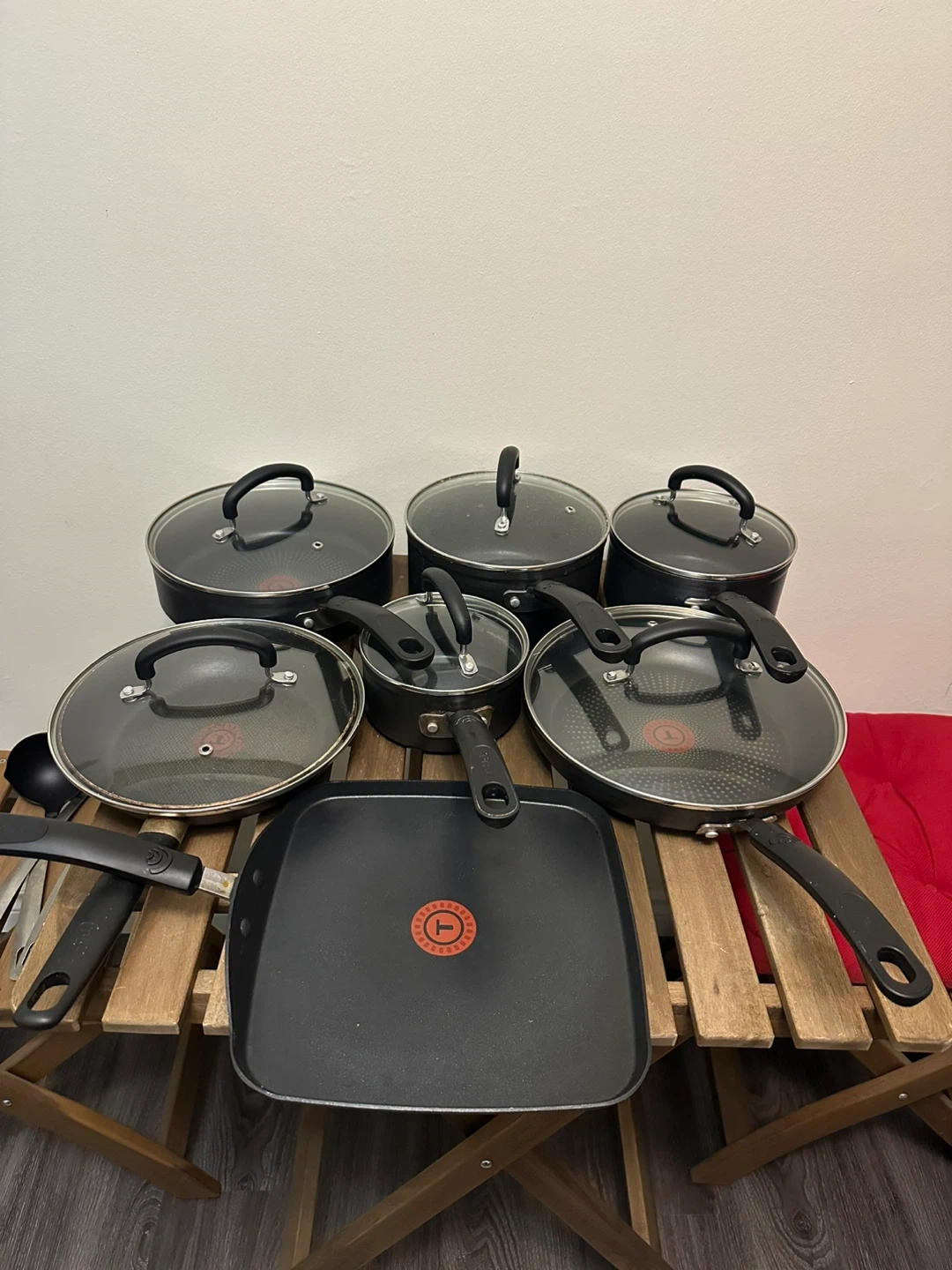 Selling a gently used T-fal cookware set in great condition! Includes various pots, pans, and lids. Perfect for all your cooking needs!