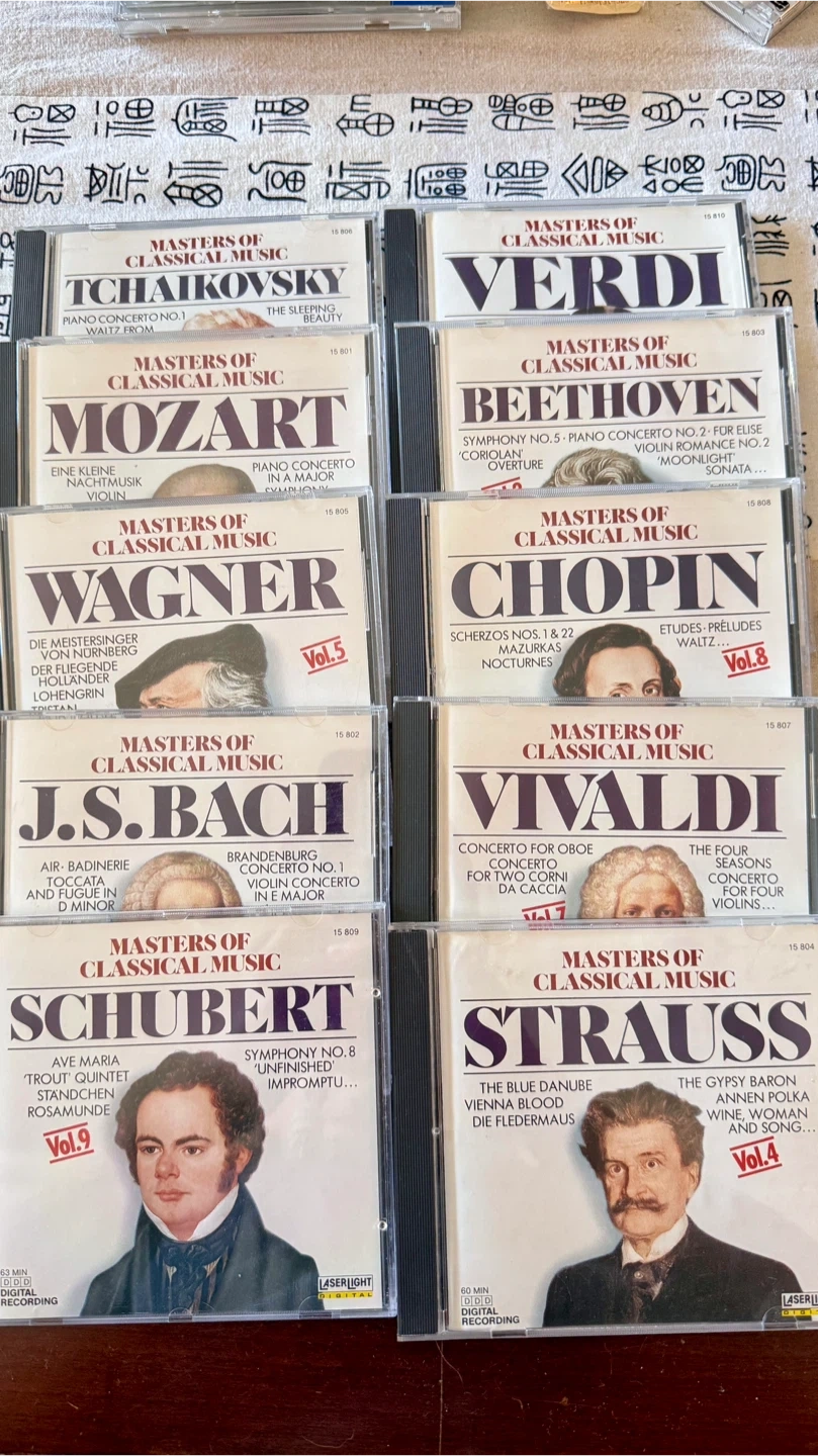 Selling a collection of classical music CDs from the "Masters of Classical Music" series. Includes composers like Tchaikovsky, Verdi, Mozart, Beethoven, Wagner, Chopin, J.S. Bach, Vivaldi, Schubert, and Strauss. Each CD features various famous works by these composers.