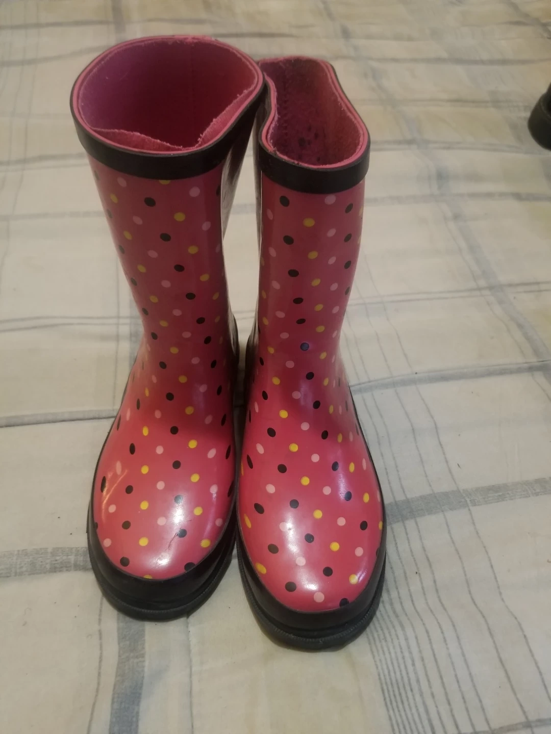 🥕 These adorable BG Zaria rain boots are perfect for keeping little feet dry on those wet days! They feature a fun pink polka dot pattern with black trim. Size 1, textile/man-made upper.