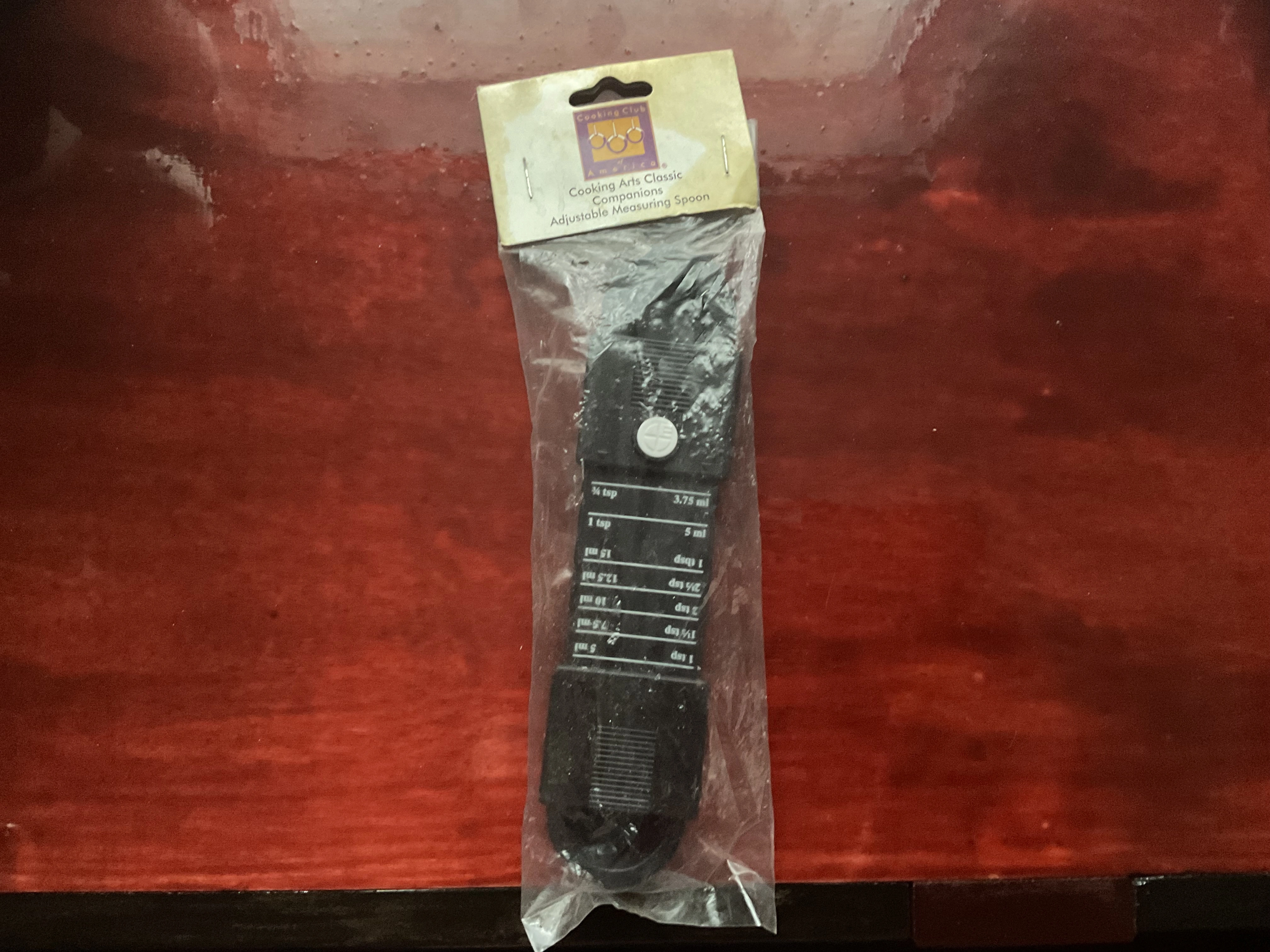 Selling a new Cooking Club America adjustable measuring spoon! It's still in its original packaging. The packaging mentions that it's easy to grip, non-stick, and dishwasher safe