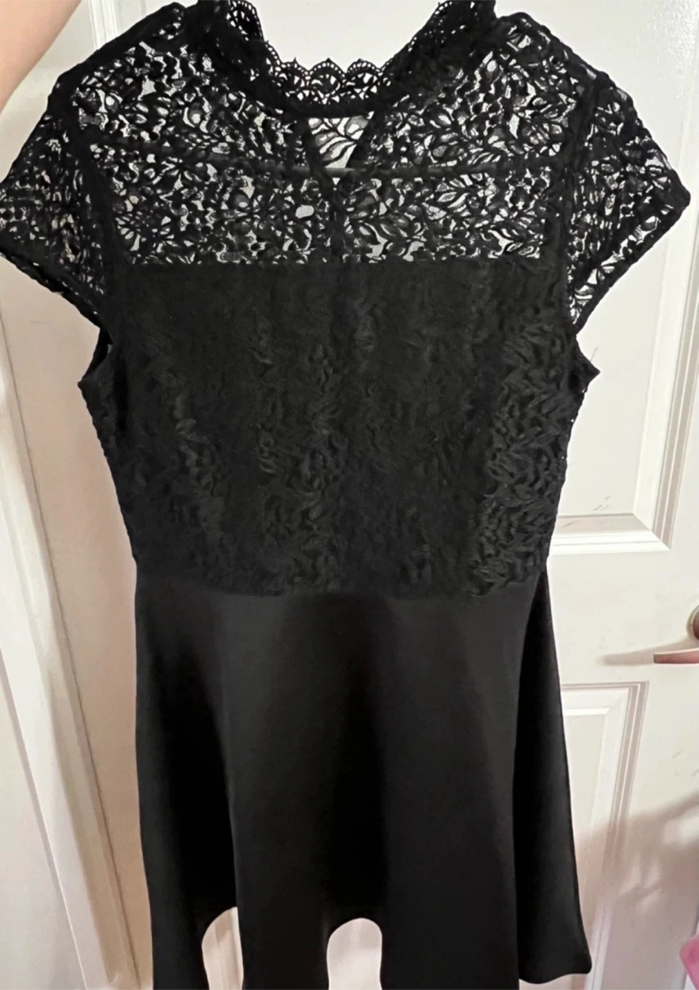 Selling a lovely black dress with a lace bodice. It's in great condition and perfect for a night out or a special occasion. The dress features a flattering fit and flare silhouette.