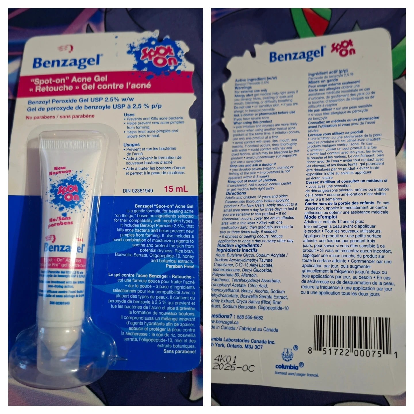 I'm selling a 15mL tube of Benzagel Spot-On Acne Gel! This gel contains benzoyl peroxide to help treat acne, prevent new pimples, and kill acne bacteria.