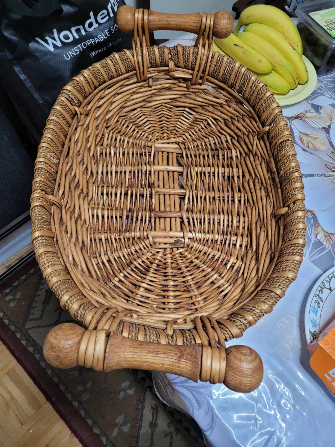 Selling a charming wicker basket with sturdy wooden handles! It's perfect for organizing items around the house or using as a decorative piece. It has a lovely, rustic feel that would complement any room