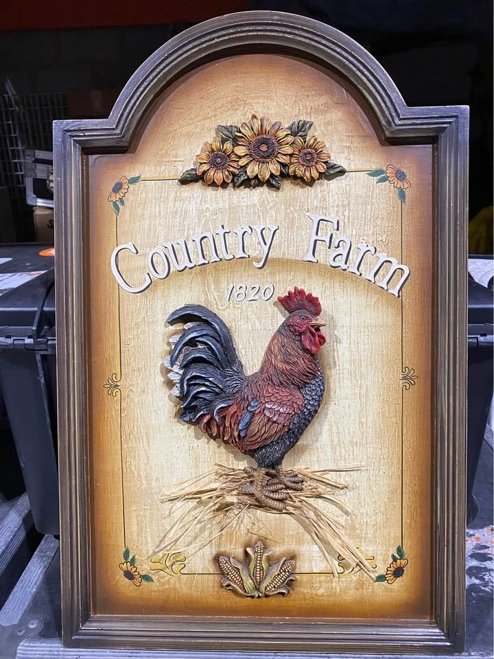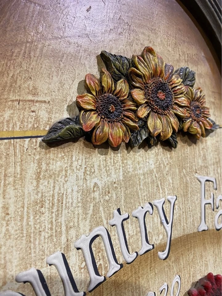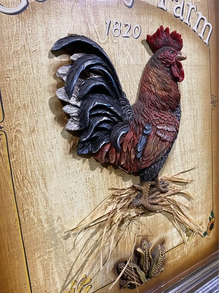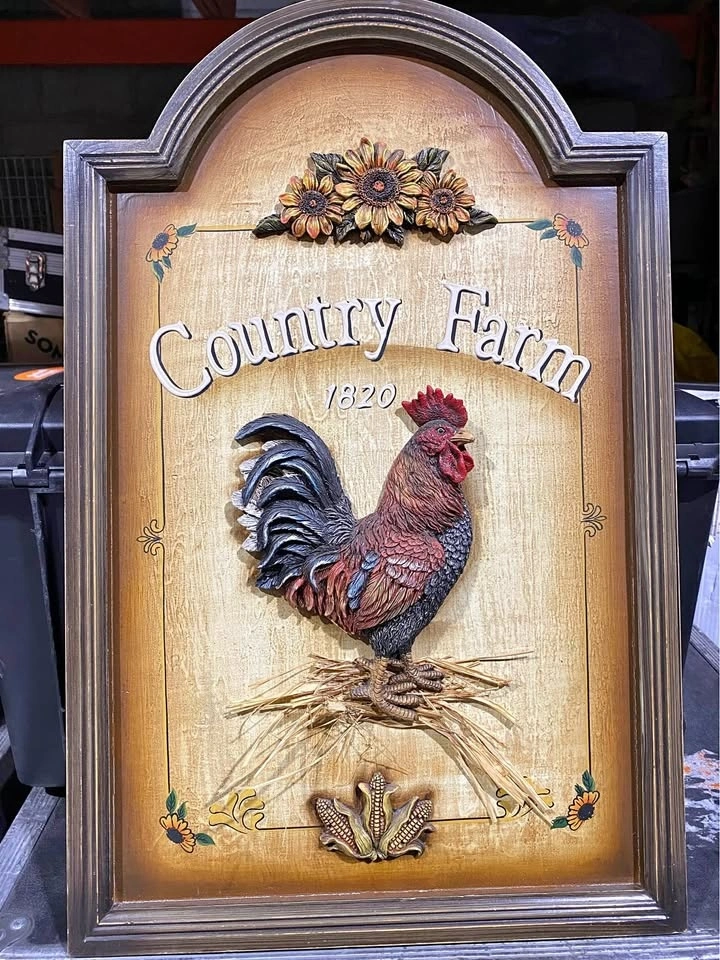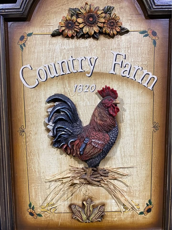 Vintage country 27 X 17x1 farm wall sign with rooster and sunflowers. Has 'Country Farm 1820' written on it. Made of wood with 3D details. In good condition.