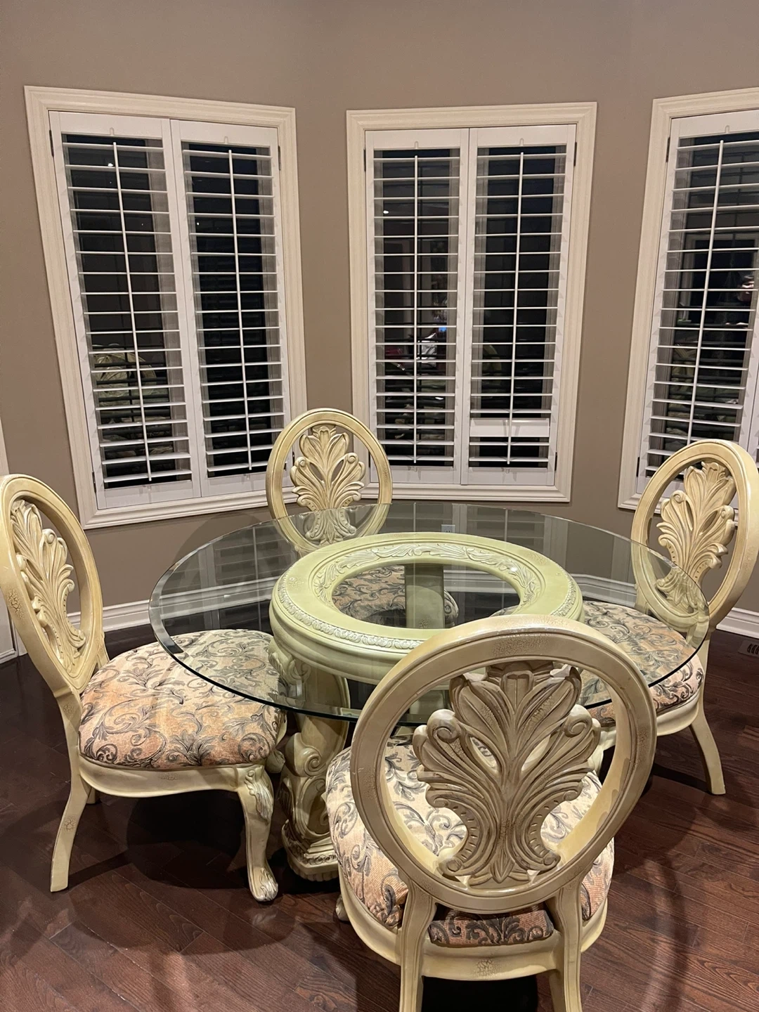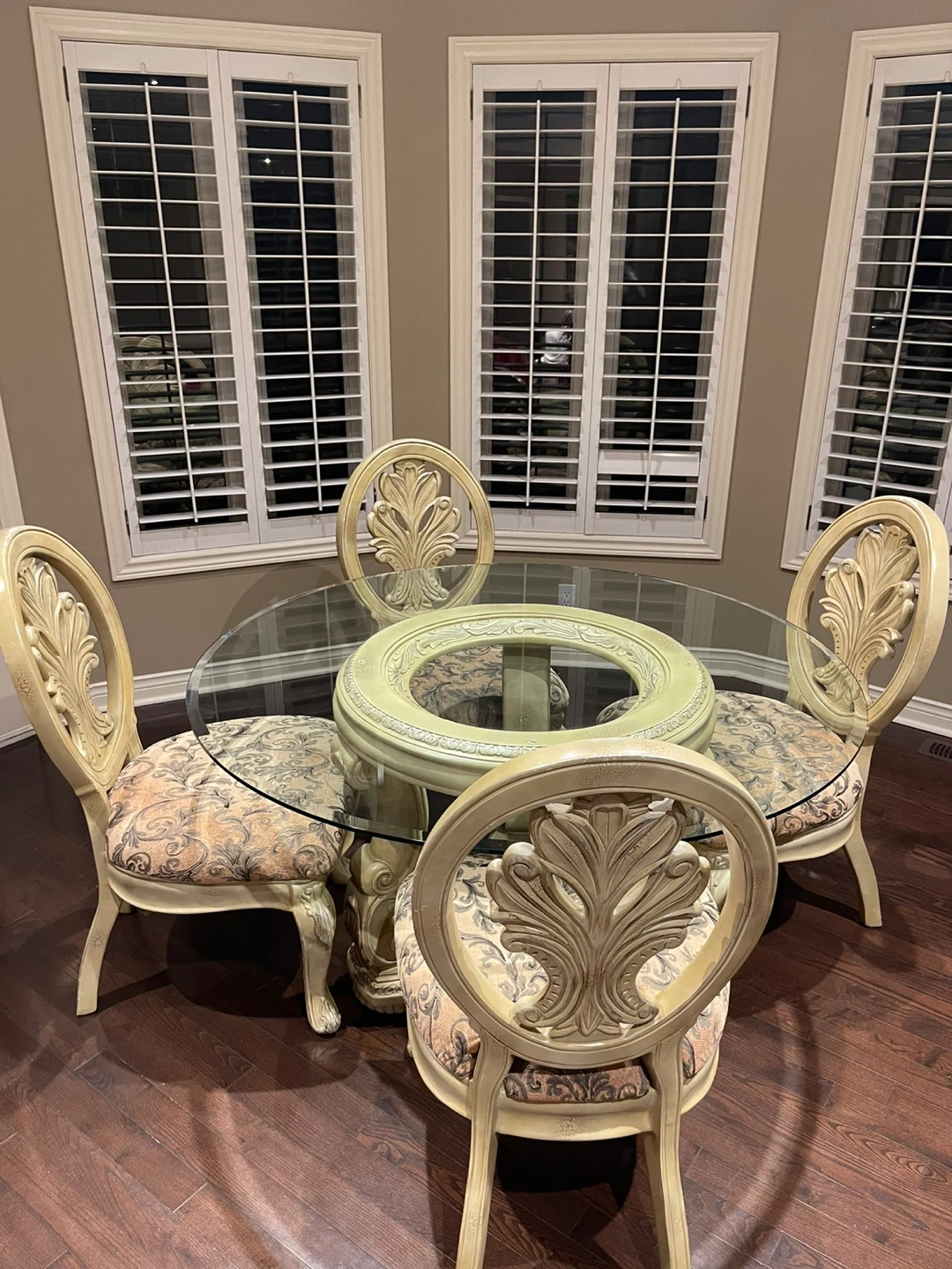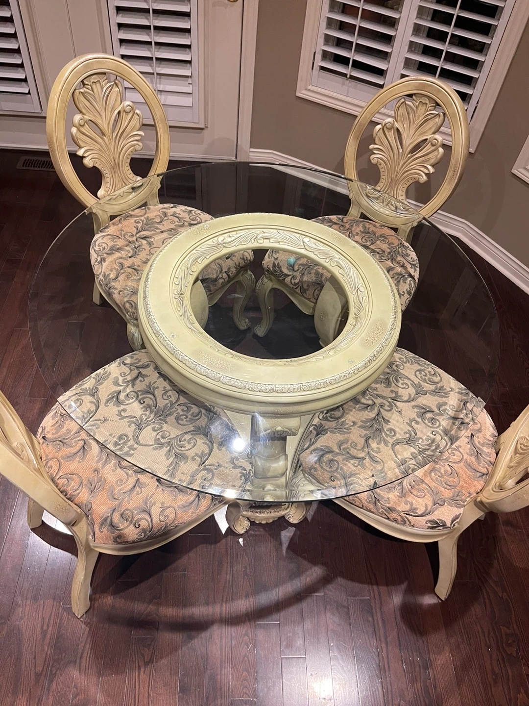Selling a lovely round glass dining table that comes with four matching chairs. It’s perfect for a smaller dining space or kitchen nook! The chairs have a unique floral pattern that adds a touch of elegance. The table is in great condition and ready for a new home!