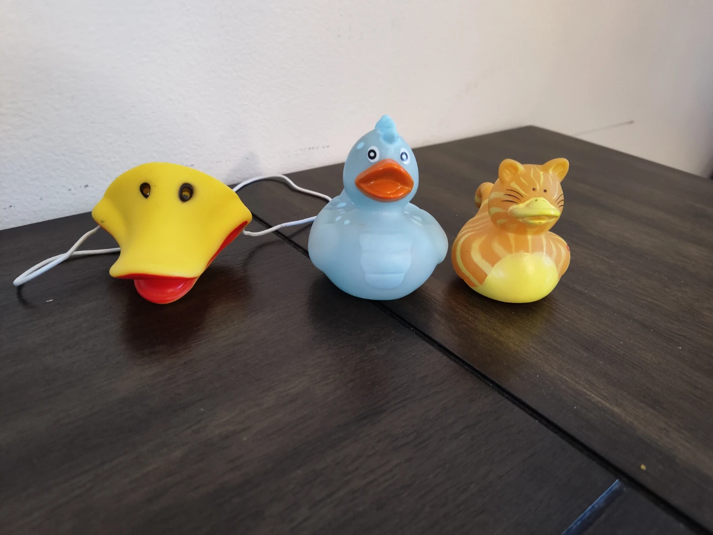 a set of three cute rubber duckies! These are great for bath time fun. One is yellow, one is light blue, and the other is orange and yellow, shaped like a kitty