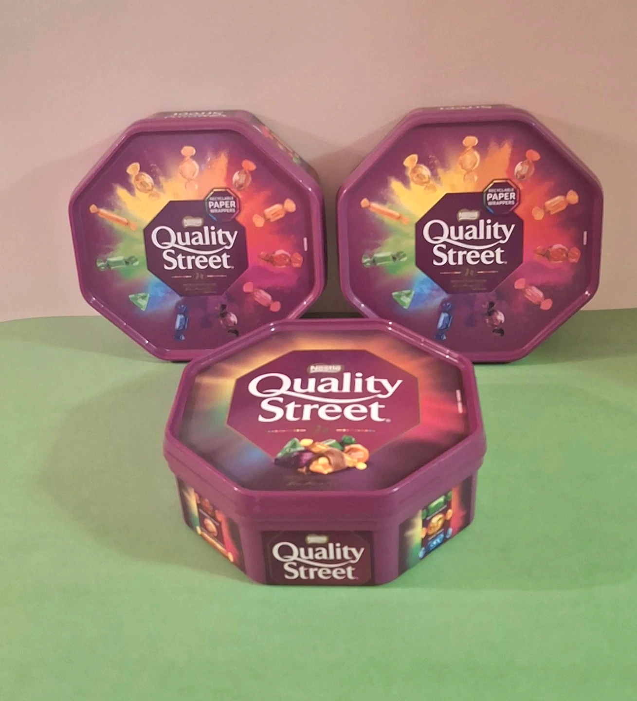 A set of 3 lightly used EMPTY plastic storage containers, suitable for candies, cookies, and knick knacks, for just $10. These lovely collectible octagonal purple Quality Street containers are from the UK.