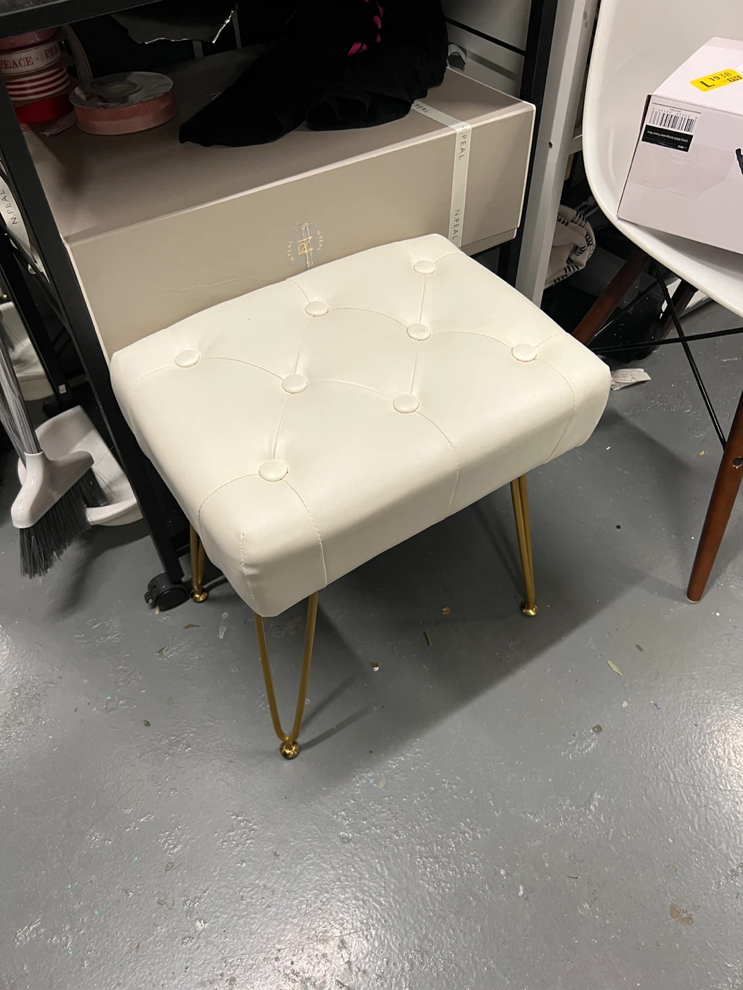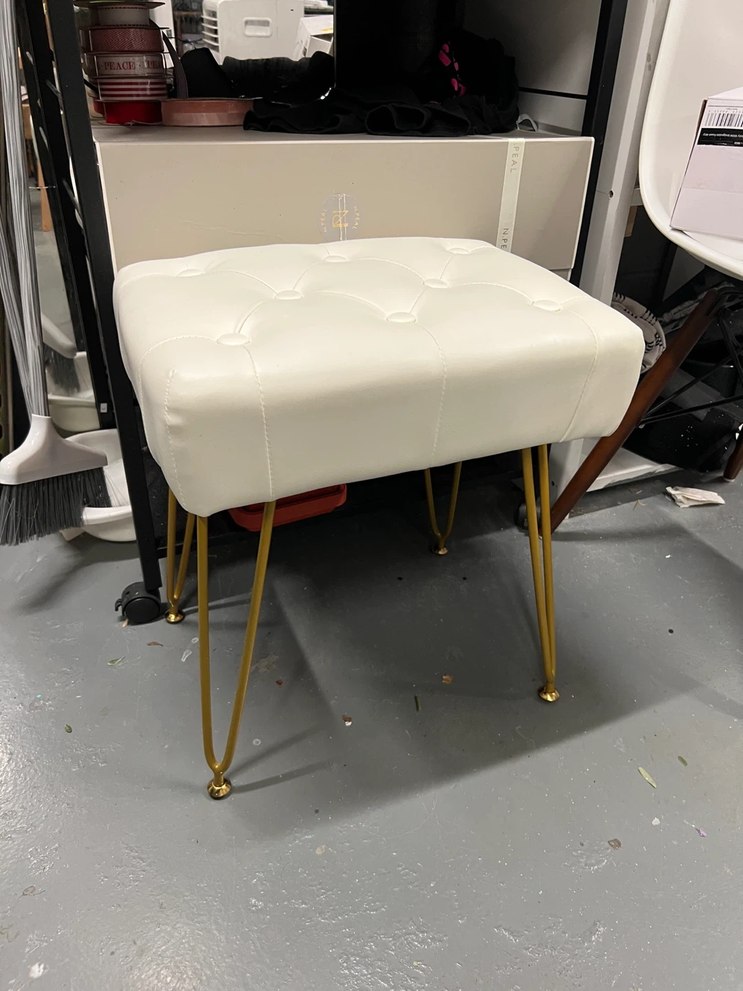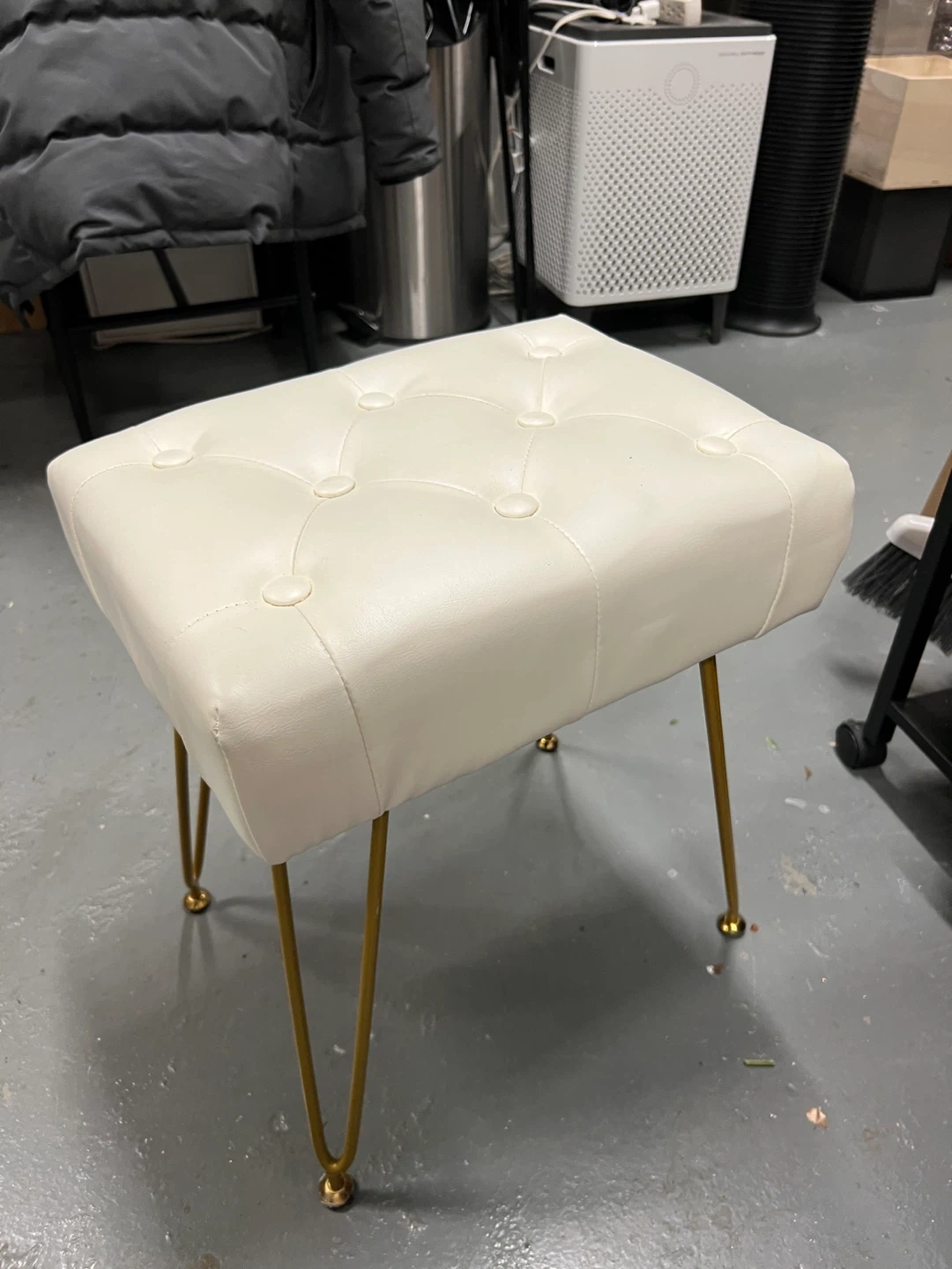 This is a stylish white tufted vanity stool with gold legs. It's in great condition and would be a perfect addition to any bedroom or bathroom. The stool is comfortable and sturdy, making it ideal for getting ready in the morning or relaxing in the evening