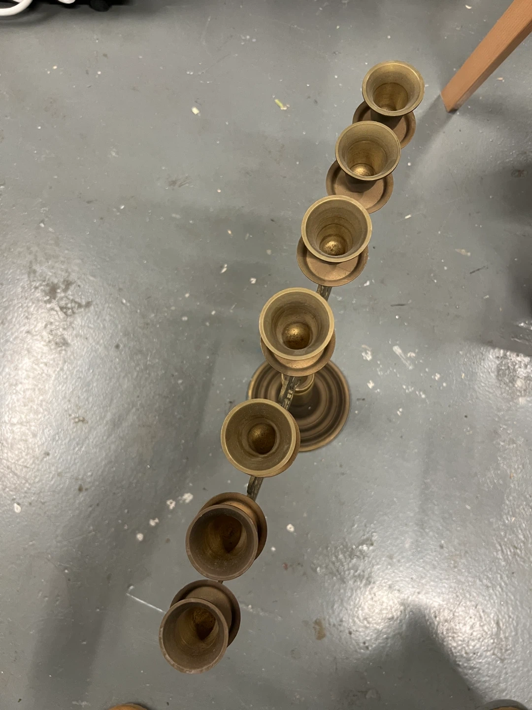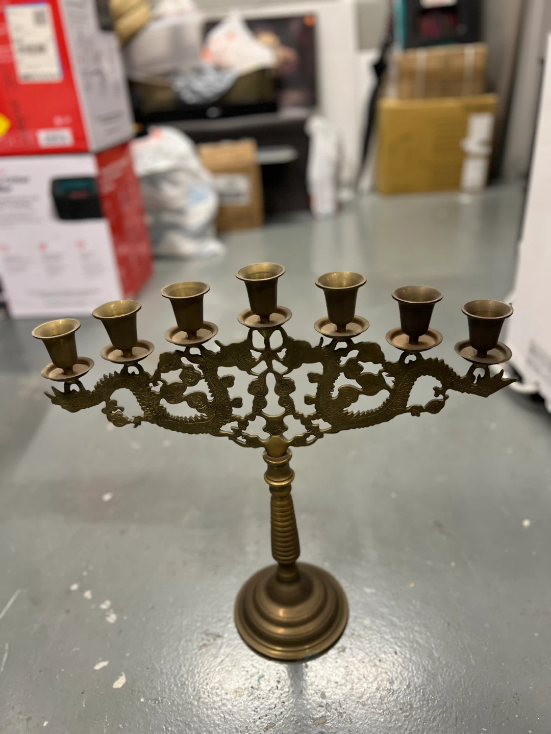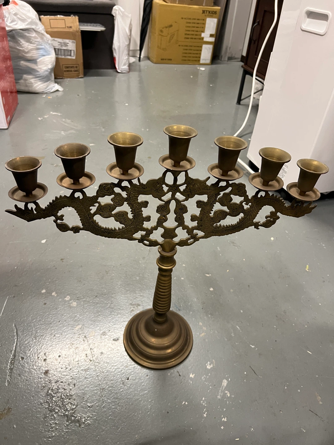 This is a beautiful brass menorah candlestick holder. It features a dragon design along the base and holds seven candles. It's in fair condition and would make a lovely addition to your home or religious practice